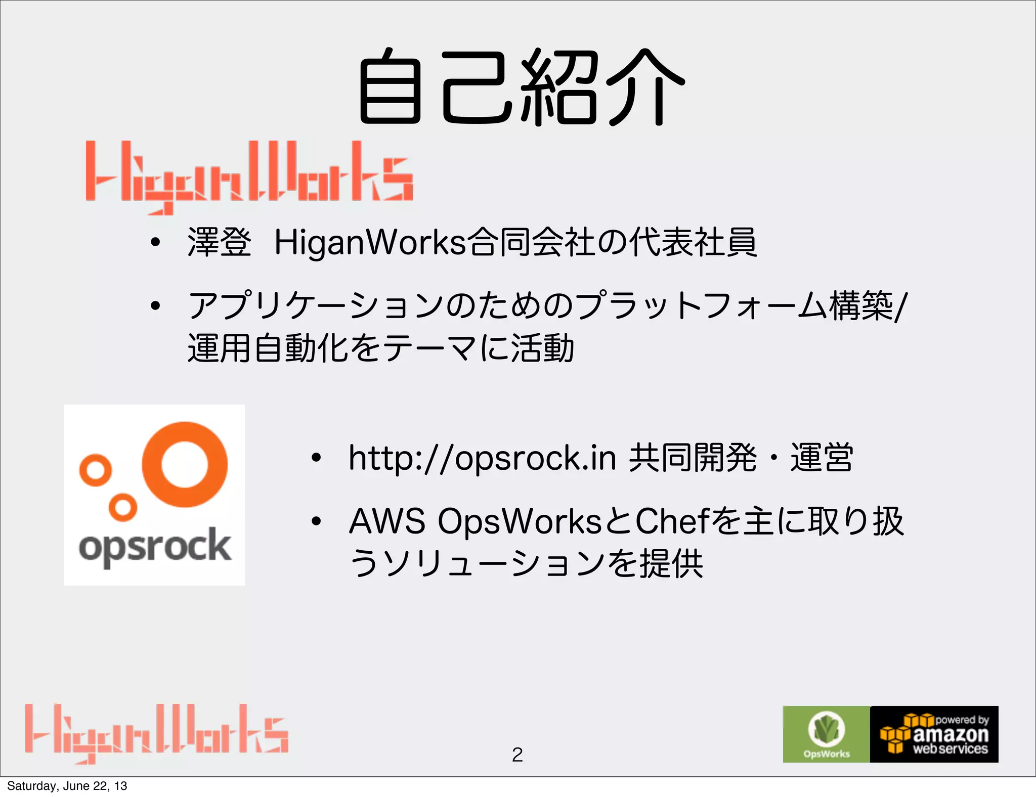 "sample_stack" }, "layers": { "db-master": { "id": "e554fc61-25f0-4cde-ab21-0fb890f586b6", "name": "MySQL Master", "instances": { "db-master1": { "public_dns_name": "ec2-54-250-66-243.xxx", "ip": "54.250.66.243", "private_ip": "10.154.17.254", "private_dns_name": "ip-10-154-17-254.xxx" } } } "mysql": { "server_root_password": "root_password" } } ※一部抜粋 Saturday, June 22, 13