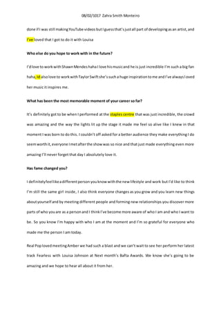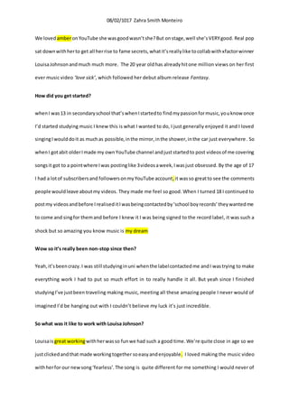 Zahra Smith Monteiro interviews up-and-coming pop star Amber, who discusses her rise to fame through YouTube covers at age 13, being signed to a record label at age 18, and her busy career since, including collaborating with Louisa Johnson. Amber says the most memorable moment so far was performing at the Staples Center for an amazing crowd that made her feel she was born to do this. She hopes to work with Shawn Mendes and Taylor Swift in the future.