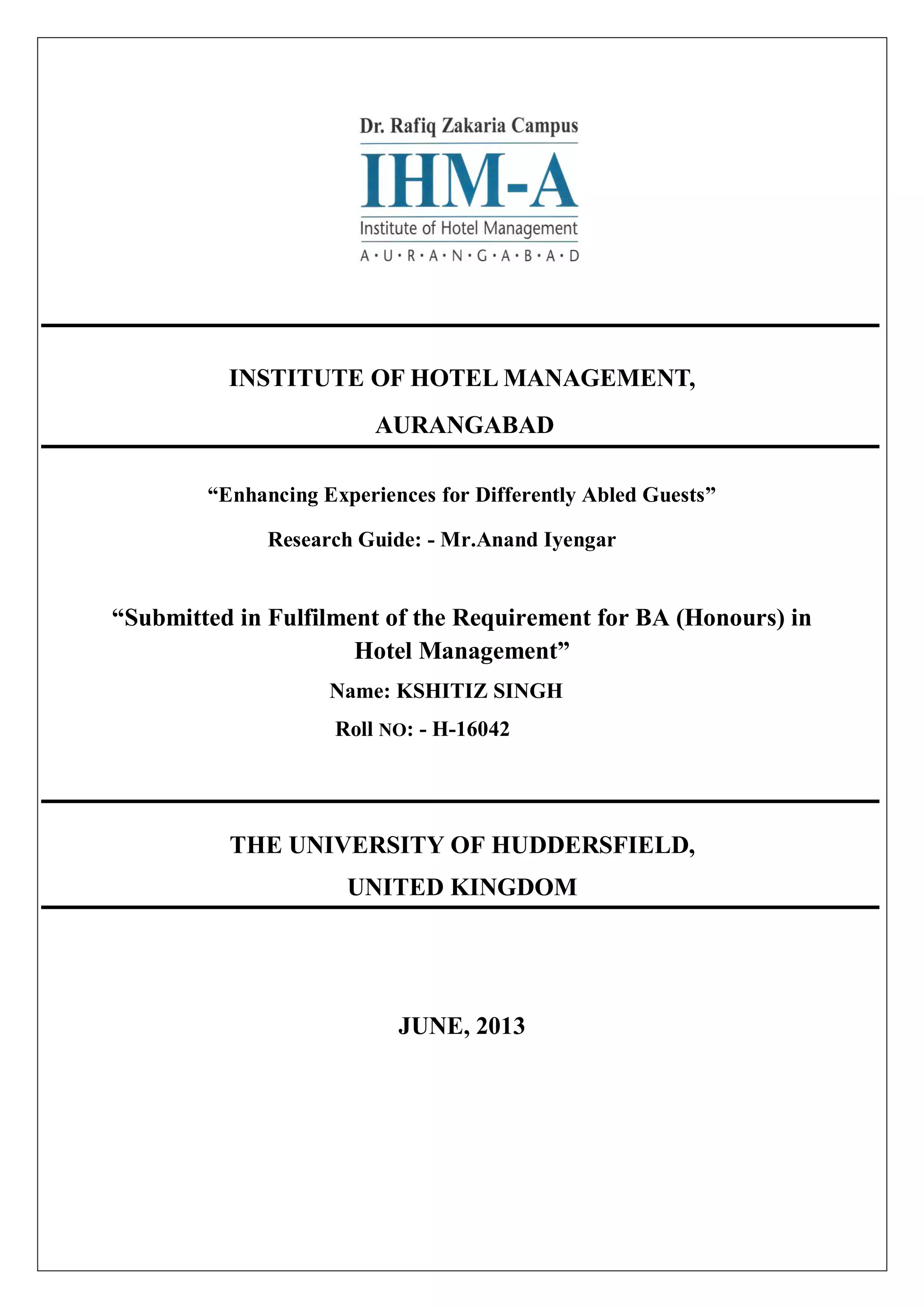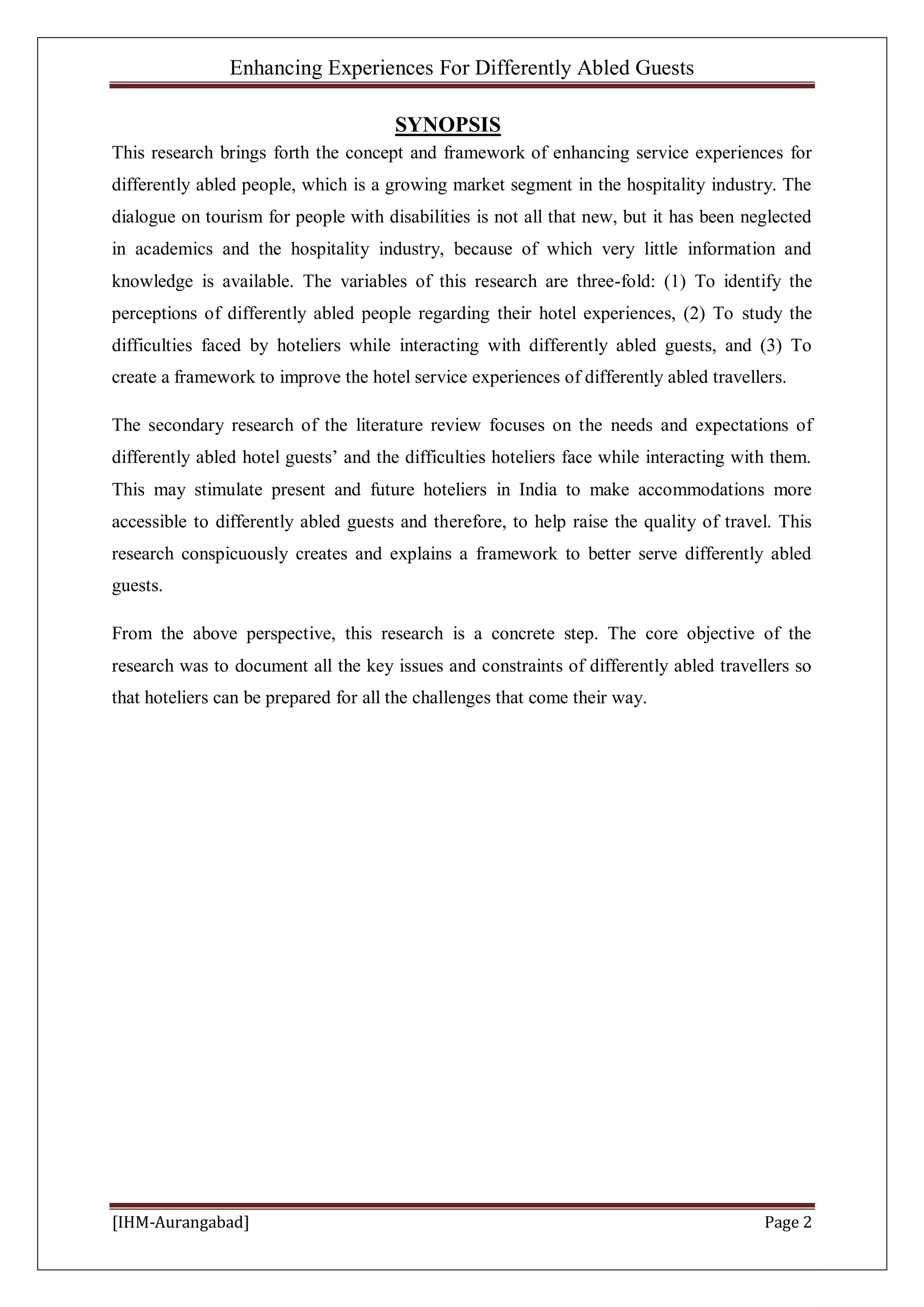 This document summarizes a research paper submitted by Kshitiz Singh to the Institute of Hotel Management in Aurangabad, India in fulfillment of a Bachelor's degree in Hotel Management. The research aims to develop a framework to enhance service experiences for disabled guests in hotels. It identifies perceptions of disabled guests regarding hotel experiences, difficulties faced by hoteliers in serving disabled guests, and creates a framework to improve services. The literature review covers needs of disabled guests and challenges faced by hoteliers. The research methodology includes interviews with disabled guests and hotel managers. The findings relate to sensitivity, communication, accessibility, challenges, and initiatives regarding disabled guests. The conclusion discusses implications for hotel managers and scope for future research.