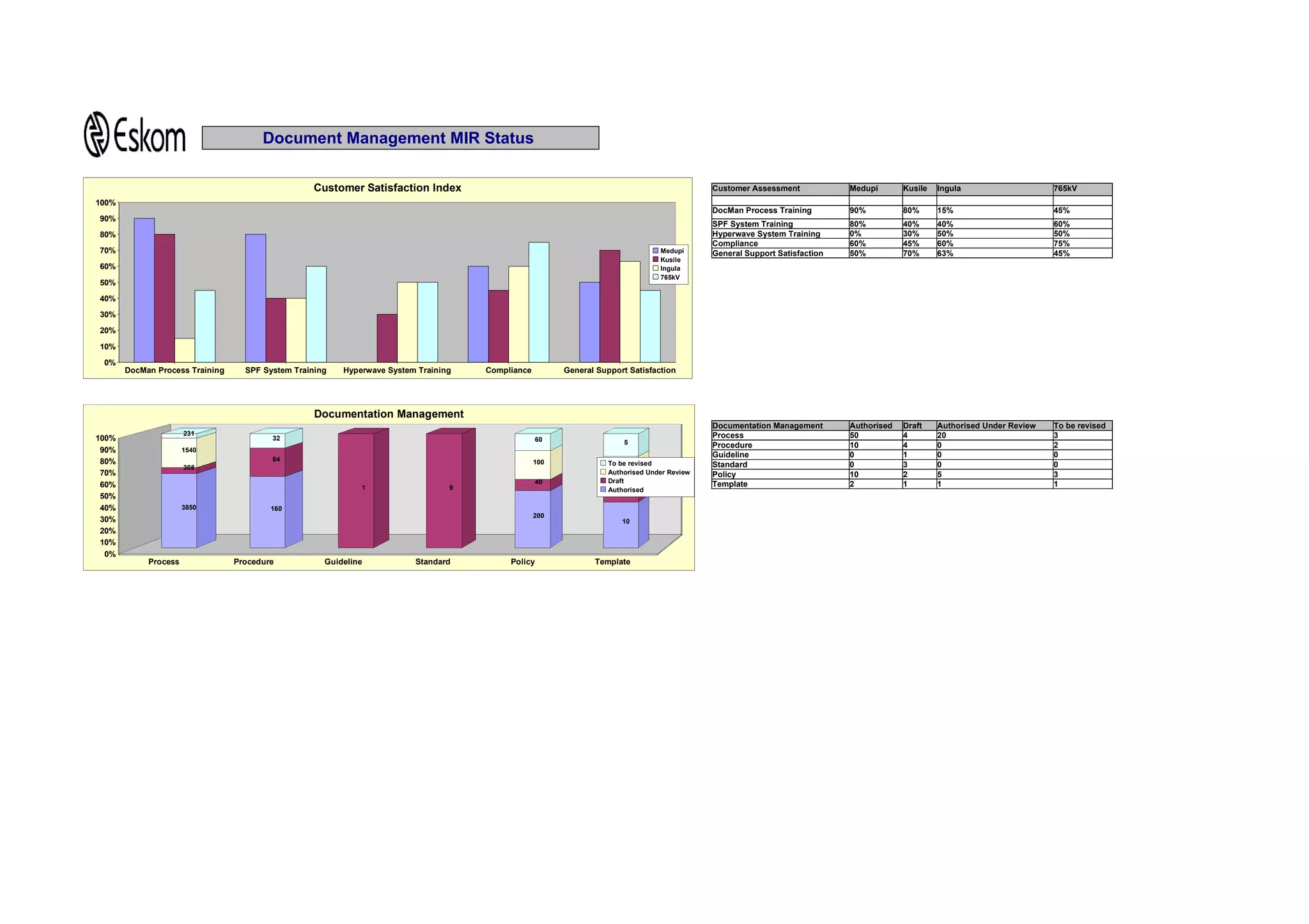 The document summarizes the status of documentation management on several Eskom projects. It shows that customer satisfaction and training completion rates are below targets for the Medupi, Kusile, and Ingula projects as well as the 765kV project. Various documentation such as processes, procedures, guidelines, standards, and policies are at different stages of development and authorization.
