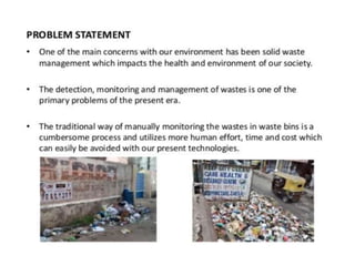 The document proposes an IoT-based waste management system using smart dustbins to address garbage overflow, which creates unhygienic conditions and health risks. It describes the use of sensors to monitor garbage levels and weight, enabling automated notifications for collection while maintaining cleanliness through odor control measures. The project aims to enhance urban cleanliness and support India's Swachh Bharat Abhiyan initiative by making waste management more efficient and reducing human intervention.