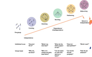 Groups are defined as two or more individuals interacting to achieve objectives. Groups go through stages of development including forming, storming, norming, performing, and adjourning. However, groups do not always progress linearly and can revert to earlier stages. Effective teams have a common purpose, specific goals, accountability, and manage conflict through a team charter outlining roles and responsibilities. Context, composition, and process influence team effectiveness.