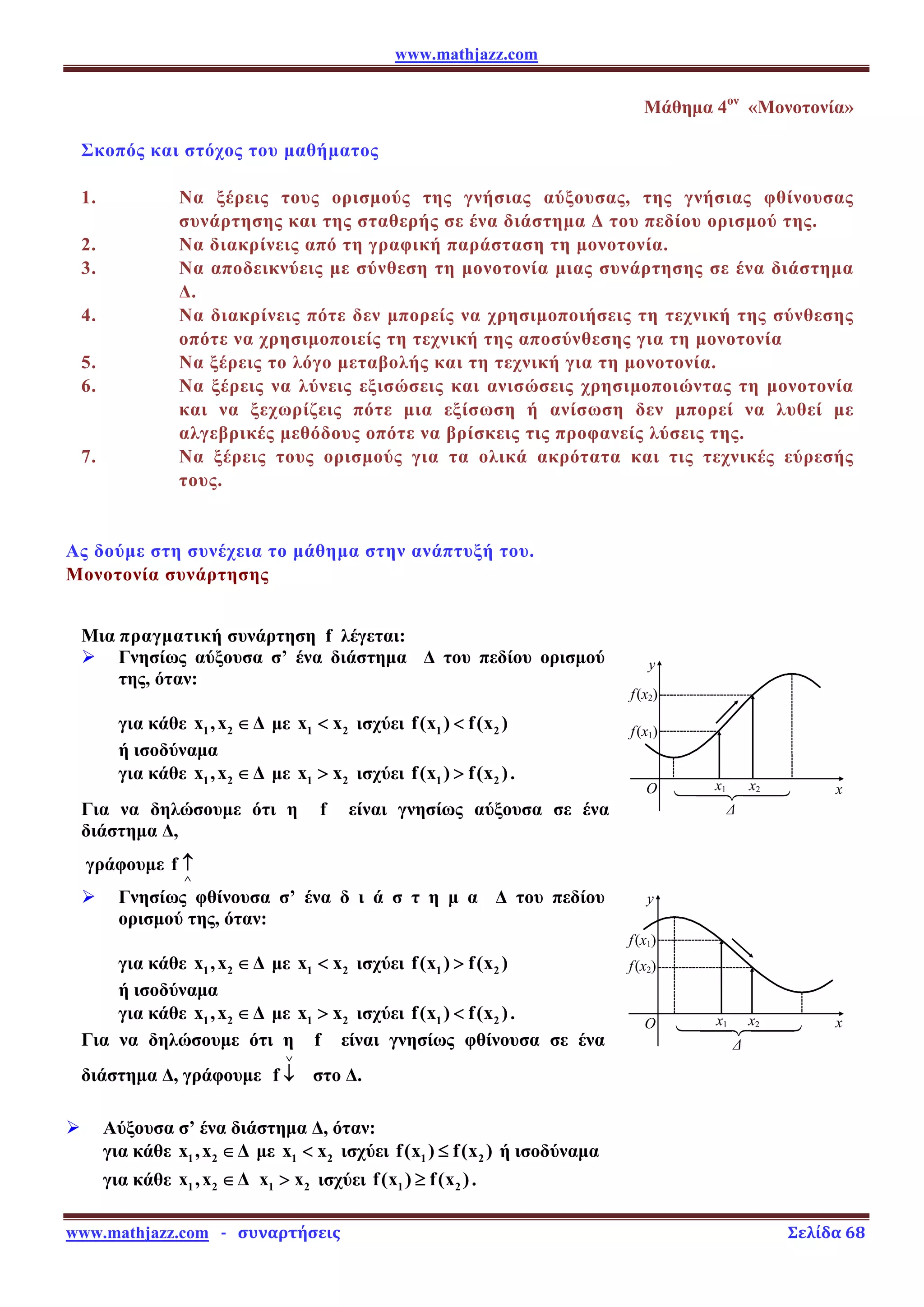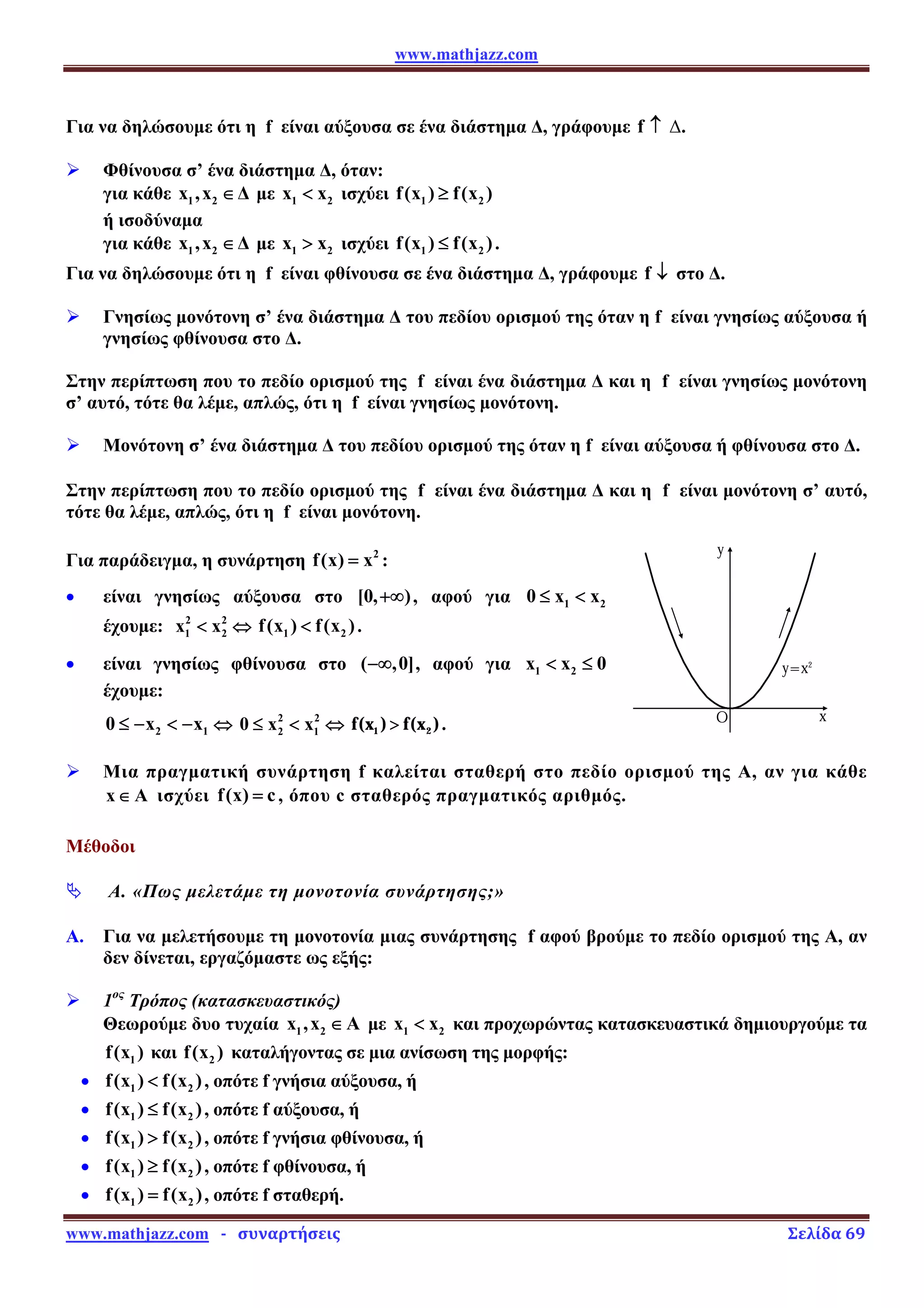 ¾ Μονότονη σ’ ένα διάστημα Δ του πεδίου ορισμού της όταν η f είναι αύξουσα ή φθίνουσα στο Δ.
