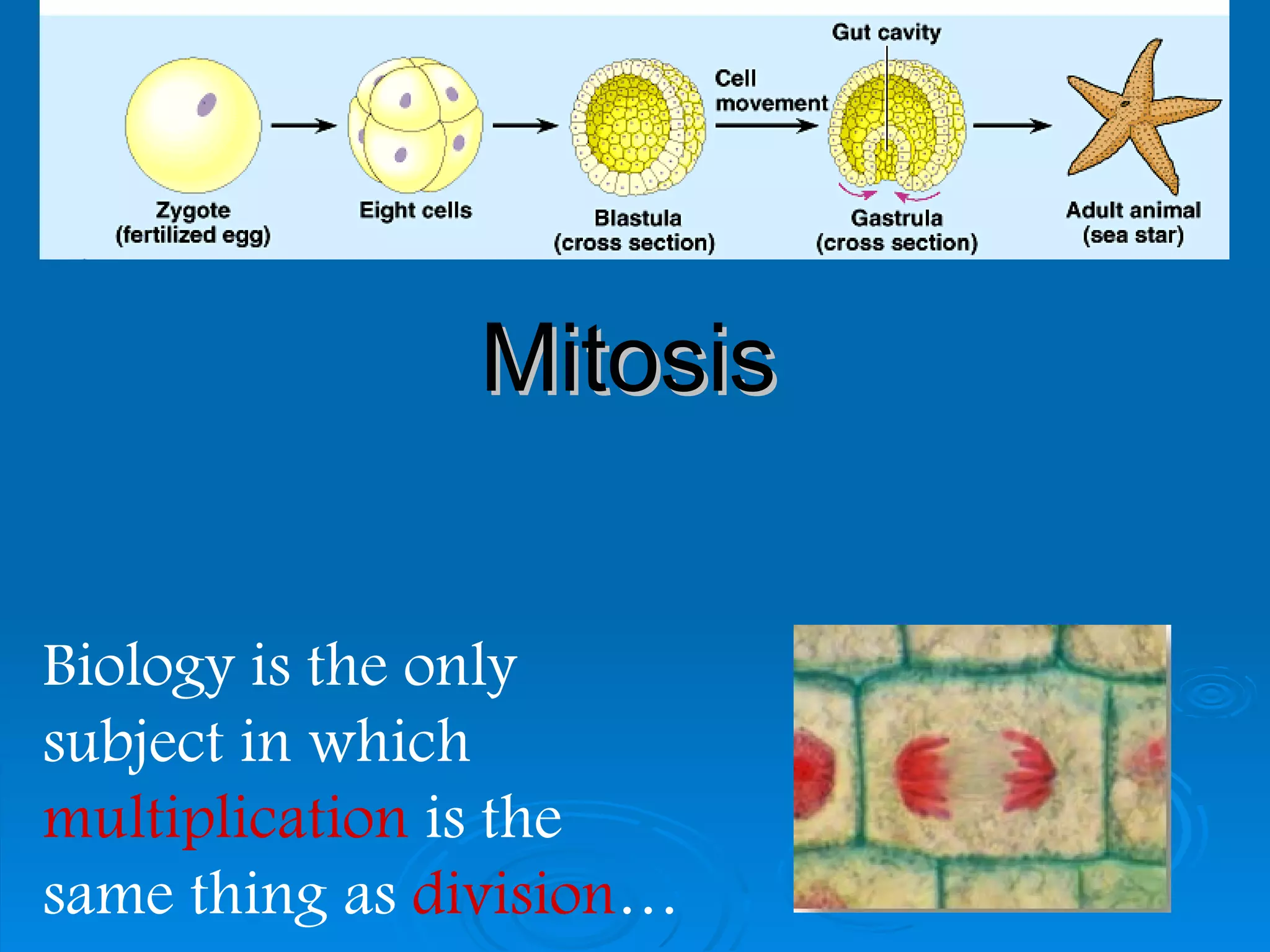 Mitosis is the process by which cells divide. It begins with the duplication of DNA and packaging of the DNA into chromosomes. The cell then undergoes several stages - prophase, metaphase, anaphase and telophase - where the chromosomes align, separate, and are divided between two daughter cells. Cytokinesis then completes the process by physically dividing the cytoplasm and organelles between the two new cells. Careful regulation ensures cells only divide when needed for growth, development, or repair.