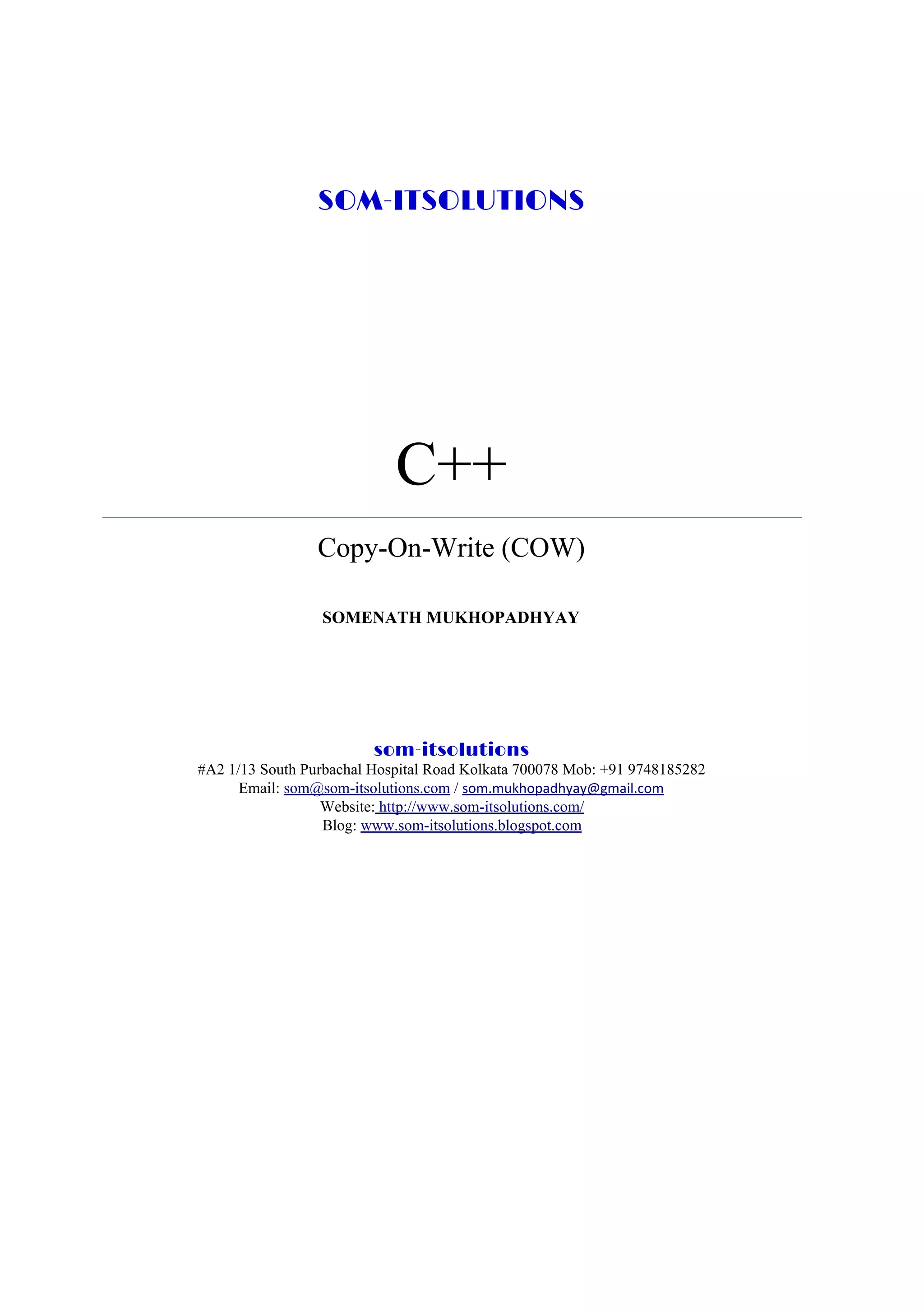 This document explains the concept of Copy-On-Write (COW) through an implementation of a C++ String class that utilizes COW. It defines a StringHolder class to store the character data and a reference count. The MyString class uses StringHolder and implements copy constructor, assignment operator, and concatenation to share the underlying data and increment the reference count rather than copying until data is modified. This allows efficient memory usage through deferred copying until a string is changed.