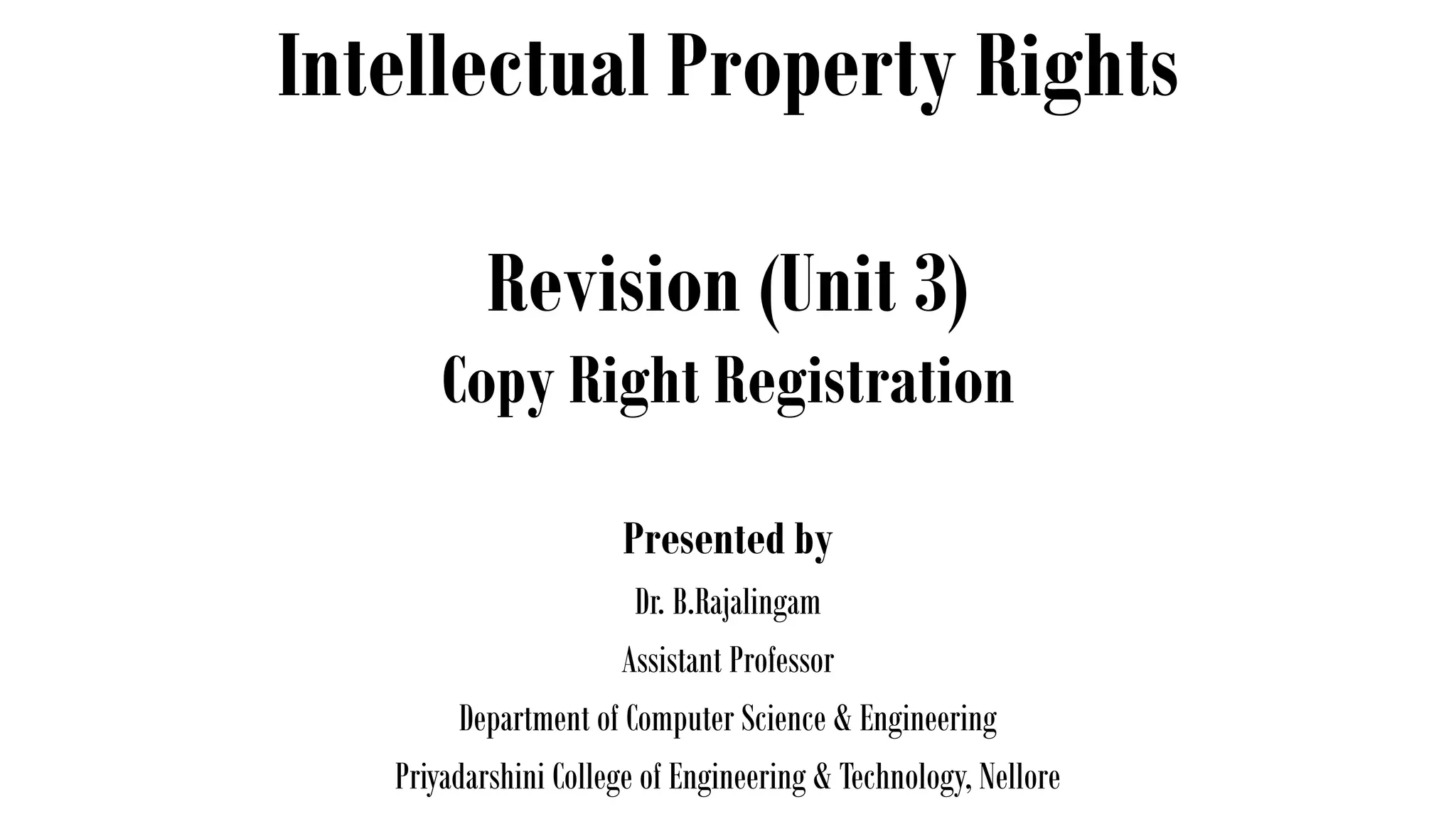 The document discusses copyright registration and intellectual property rights. It covers the fundamentals of copyright law, including original works, rights of reproduction, copyright ownership, registration, and international copyright law. The key points covered are:
