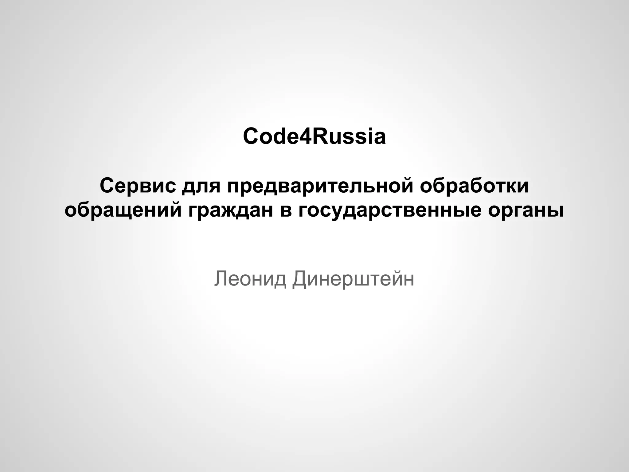 Документ описывает сервис code4russia, предназначенный для обработки обращений граждан в государственные органы. Он включает функции, такие как выдача ответов на вопросы и контактные данные ведомств, а также содержит административный интерфейс для управления данными. Используемые технологии включают Solr, Ruby on Rails и MySQL, с акцентом на мобильную оптимизацию и возможность интеграции через REST API.