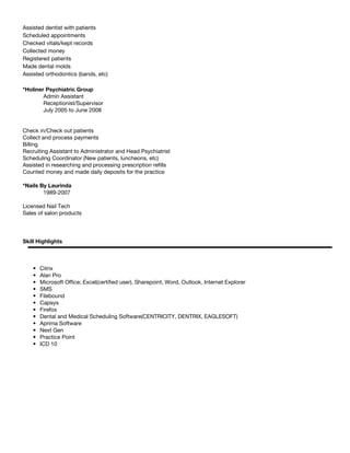 Laurinda Scott has over 15 years of experience working in medical and dental offices. Her most recent role was as office manager and front desk coordinator at Dr. Samuel Steinmetz's dermatology office where she performed duties like scheduling appointments, verifying insurance, and obtaining prior authorizations. Prior to that, she held roles like medication coordinator at a psychiatric group and registered dental assistant. She has strong skills in Microsoft Office, medical billing and coding software, and customer service.