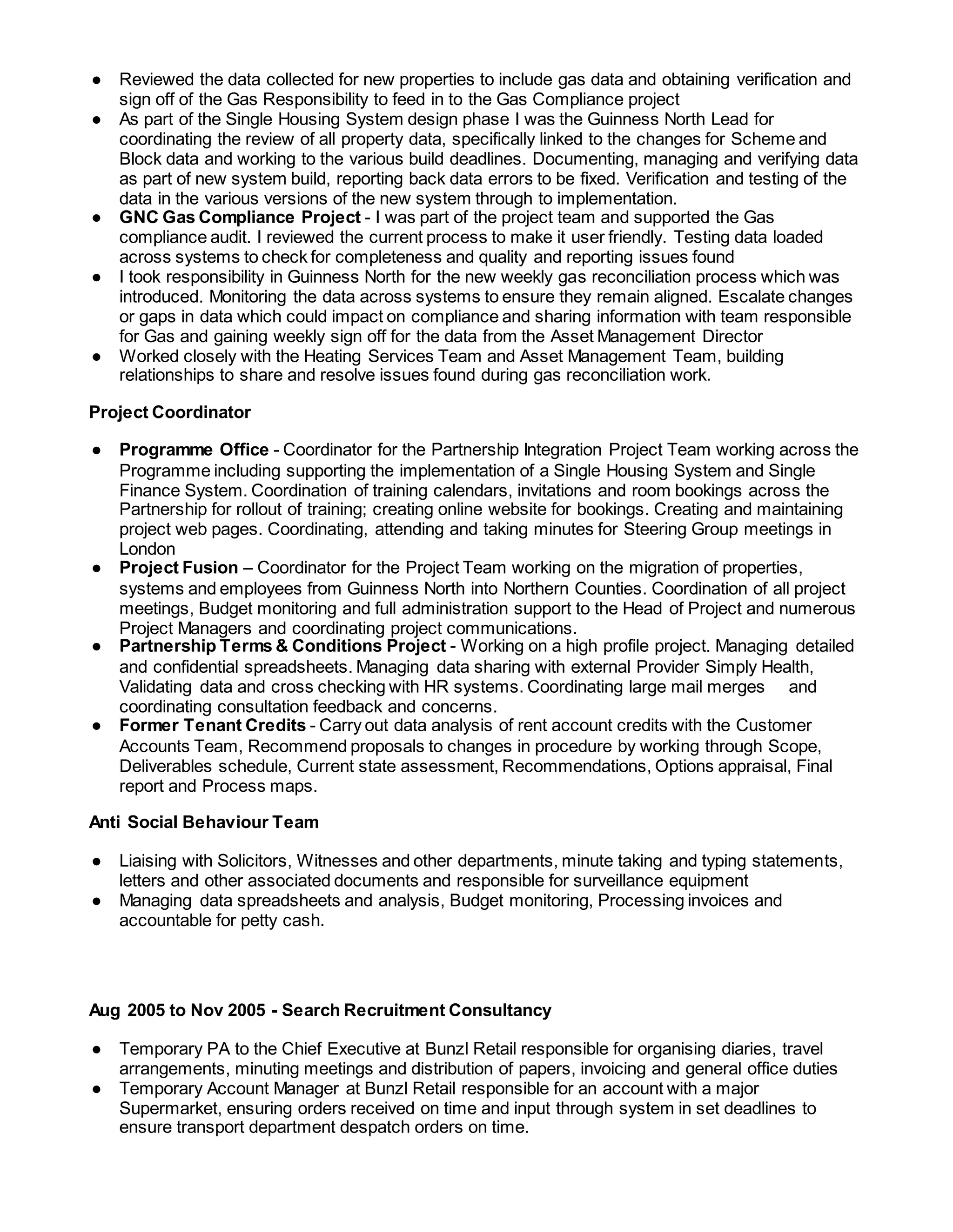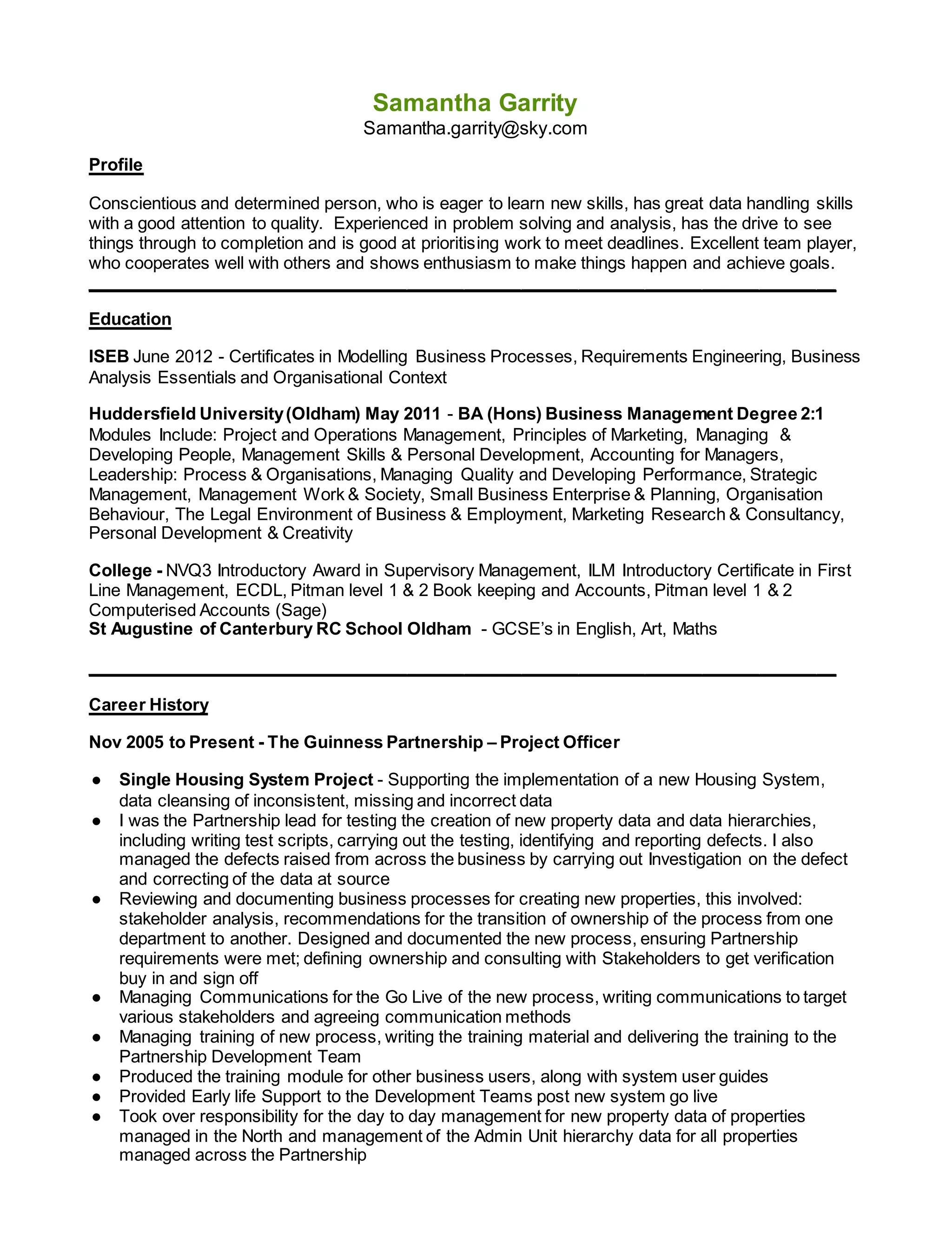 Samantha Garrity has over 15 years of experience in project coordination and administration roles. She has strong data analysis and problem solving skills. Her experience includes implementing new housing and finance systems, managing gas compliance audits, and coordinating large projects across multiple teams. She is skilled in process documentation, stakeholder engagement, and training delivery. Garrity has a BA in Business Management and certificates in business analysis, requirements engineering, and modeling business processes.