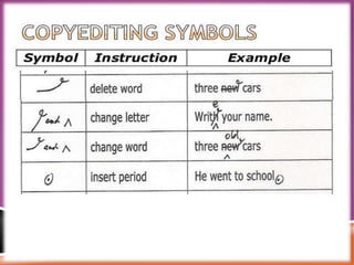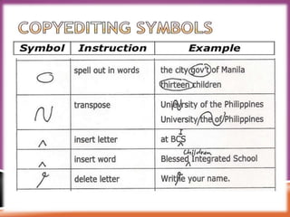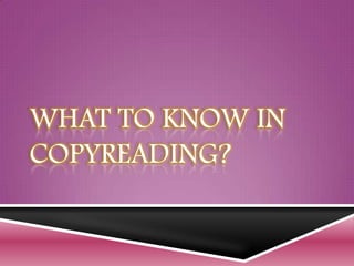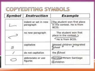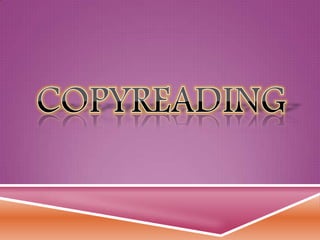 The document discusses the role and responsibilities of a copyreader. A copyreader edits news stories and other articles by correcting errors, removing biased or damaging statements, and ensuring the story follows proper structure and style guidelines. The copyreader also writes headlines and checks facts and attributions. A good copyreader must have a sharp eye for details and the ability to edit concisely. When preparing a story, reporters should type single-sided, double-spaced with indentation and sluglines to identify the story.