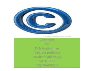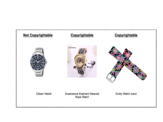 This document discusses copyright and intellectual property. It defines copyright as an exclusive legal right given to creators over their original works. Works covered by copyright include literary works, music, films, artwork, and software. Creators have economic rights like adaptation and distribution rights. Copyright protection lasts for the creator's lifetime plus 60 years. Infringement occurs through unauthorized reproduction or distribution of a copyrighted work. Exceptions allow use of works for education, research, or criticism.