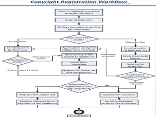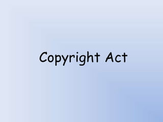 The Copyright Act protects the rights of creators of literary, dramatic, musical, artistic works and films. Copyright provides creators with exclusive rights such as reproduction, communication to the public, and adaptation. These rights last for 60 years from the death of the creator or publication for most works. Infringement occurs through unauthorized use, copying, distribution, or display of a copyrighted work. Common infringements include selling unauthorized copies or public performances. Certain uses such as research, teaching, and criticism are exempt from infringement.