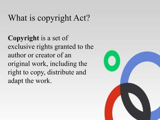 The document summarizes key aspects of copyright law. It explains that copyright is a set of exclusive rights granted to creators of original works, including the rights to copy, distribute, and adapt their work. It lists what types of works can be copyrighted, such as literary works, music, art, and more. The document notes that copyright is automatic and exists as soon as a work is fixed in a tangible form. It provides a brief history of India's Copyright Acts of 1914 and 1957, which adopted many provisions from English law and introduced new concepts.