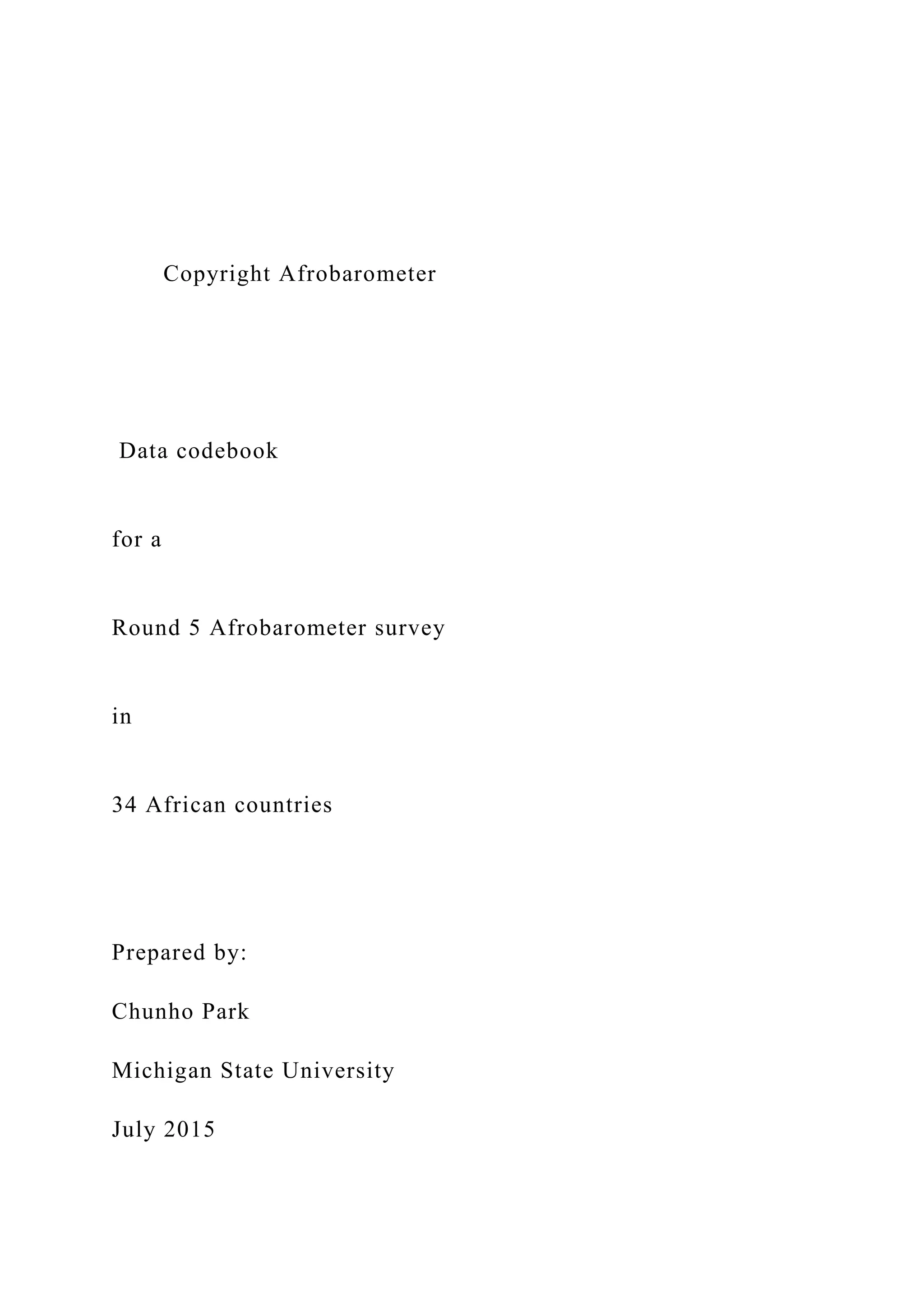 This document is a codebook for a Round 5 Afrobarometer survey conducted in 34 African countries. It provides information on the variables collected in the survey, including variable names, descriptions, response values and labels. The codebook also includes respondent identification numbers for each country, and country-specific codes for regions/provinces surveyed.