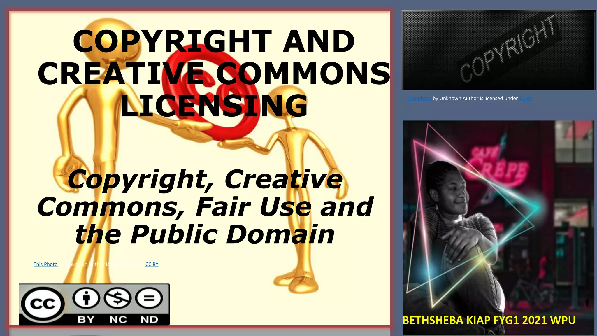 The document provides an overview of copyright law, explaining its purpose to protect creators' rights over their work and detailing the types of rights granted. It also discusses Creative Commons licenses, which allow creators to specify how their work can be used while maintaining some rights. Additionally, the document touches on fair use guidelines and the concept of public domain, outlining how works can enter this space and be used freely by the public.