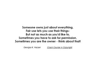 The document discusses recent amendments to U.S. Copyright Law from 2004-2005 including the Copyright Royalty Judges Program Technical Corrections Act, Family Entertainment and Copyright Act, Intellectual Property Protection and Courts Amendments Act, Satellite Home Viewer Extension and Reauthorization Act, and the Copyright Royalty and Distribution Reform Act. It also mentions that Creative Commons provides free tools to let creators easily mark their work with different copyright licenses to allow for some sharing and reuse while still maintaining some rights.