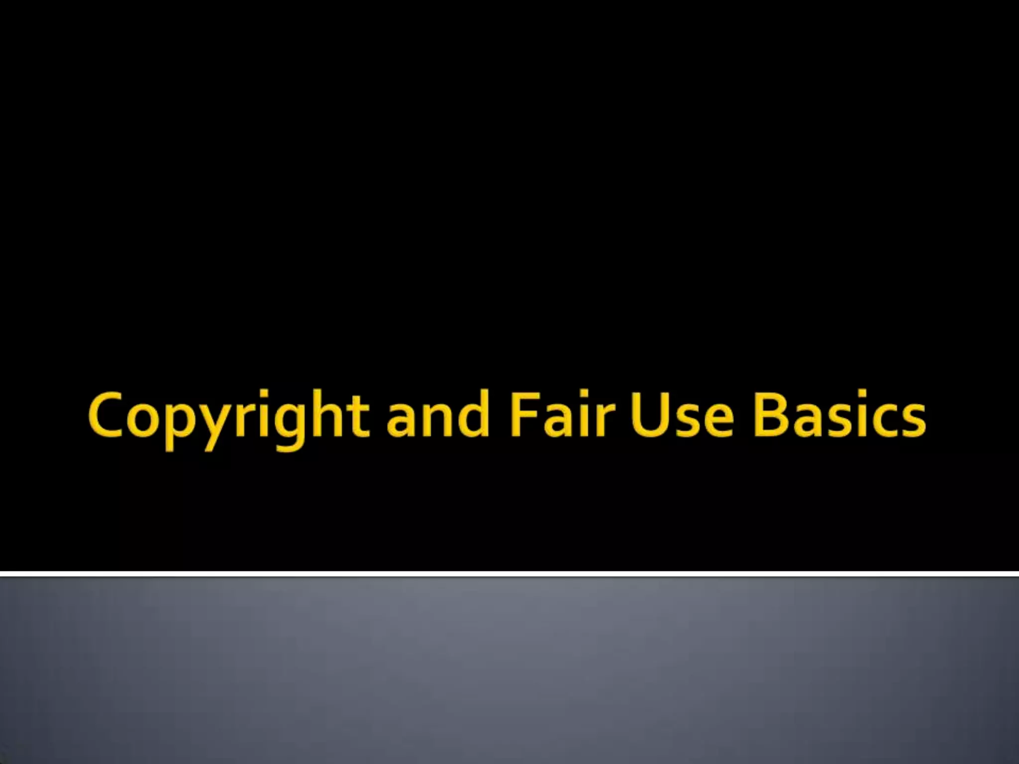 Copyright protects original works of authorship including writing, music, art, and other creative works. It exists to provide financial incentive for creative works by allowing creators to profit from their work. Anything in a fixed, tangible form is protected by copyright from the moment it is created. Educators can legally use works that are in the public domain, fall under fair use guidelines, or they have permission to use from the creator. Fair use allows limited use of copyrighted works for purposes like teaching without permission as long as it is for a non-profit educational use, only a small portion is used, and it does not harm the market for the original work.