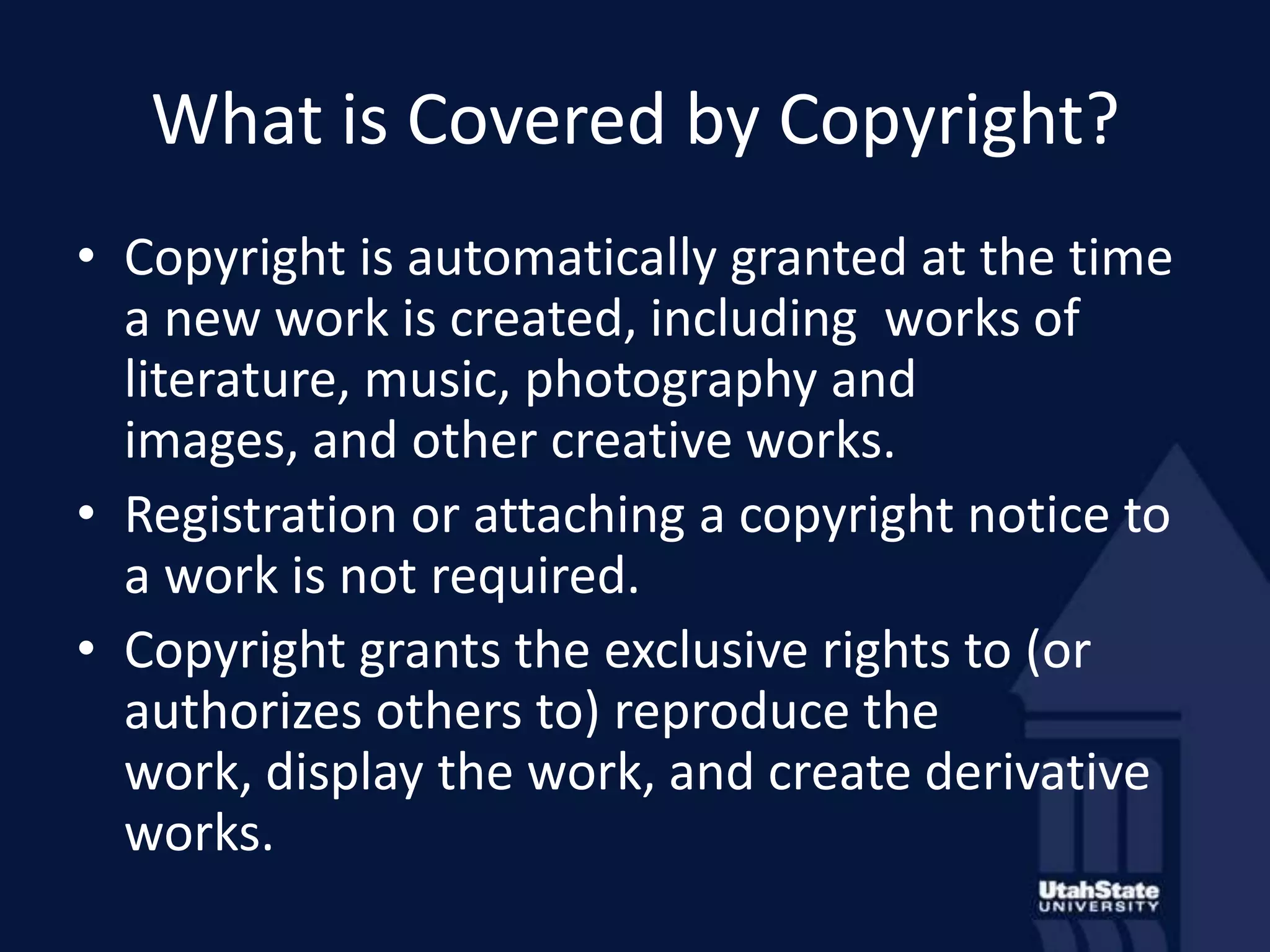 Copyright automatically protects original creative works upon creation. A work is typically protected for 70 years after the author's death. Fair use allows limited use of copyrighted works for educational purposes without permission, considering factors like the purpose/nature of the use and amount taken. Images online may have copyright restrictions like Creative Commons licenses specifying allowed uses. Adapting or revising a work requires permission unless authorized under fair use. Trademarks identify commercial sources and require attribution for informational use.