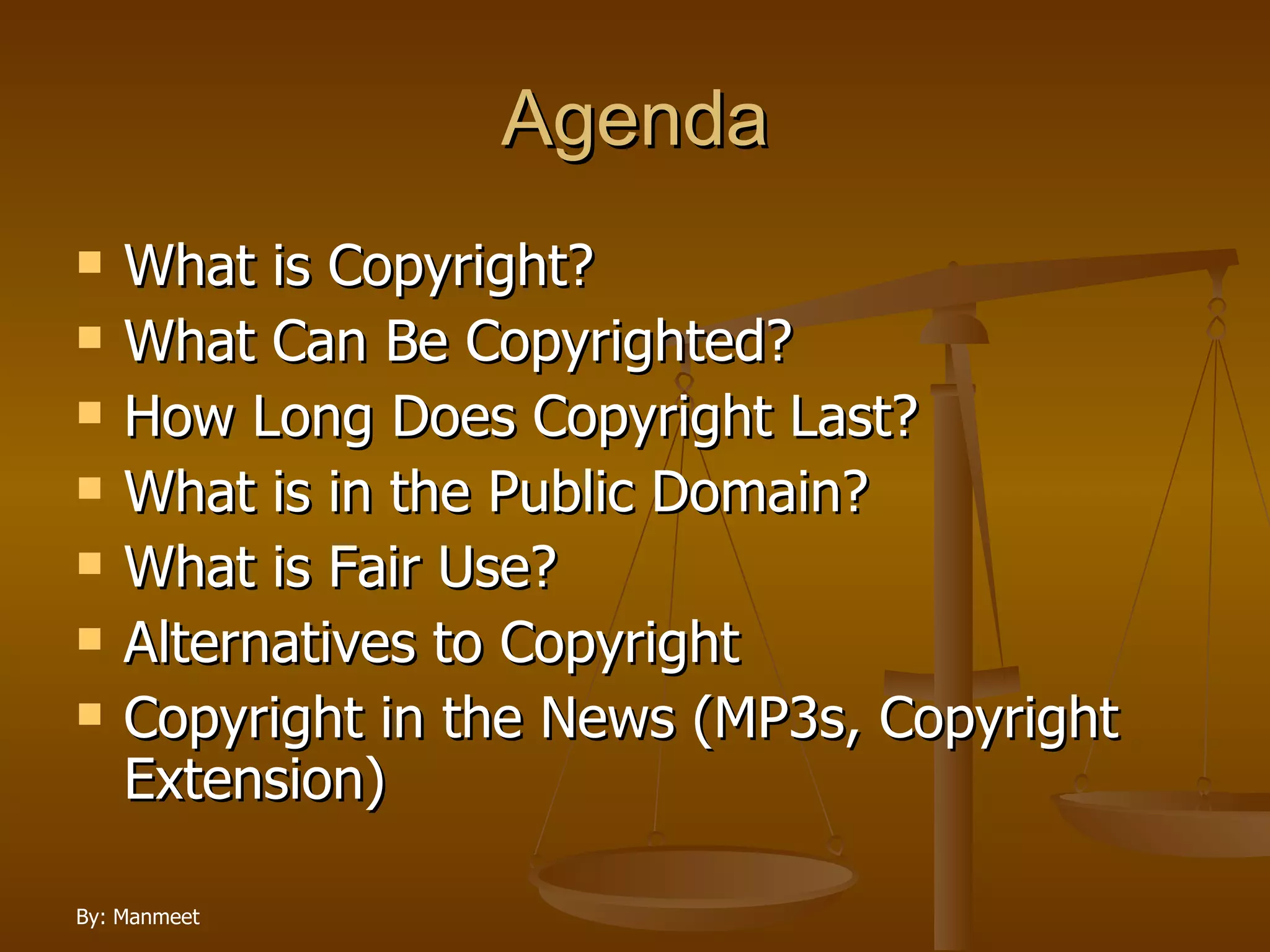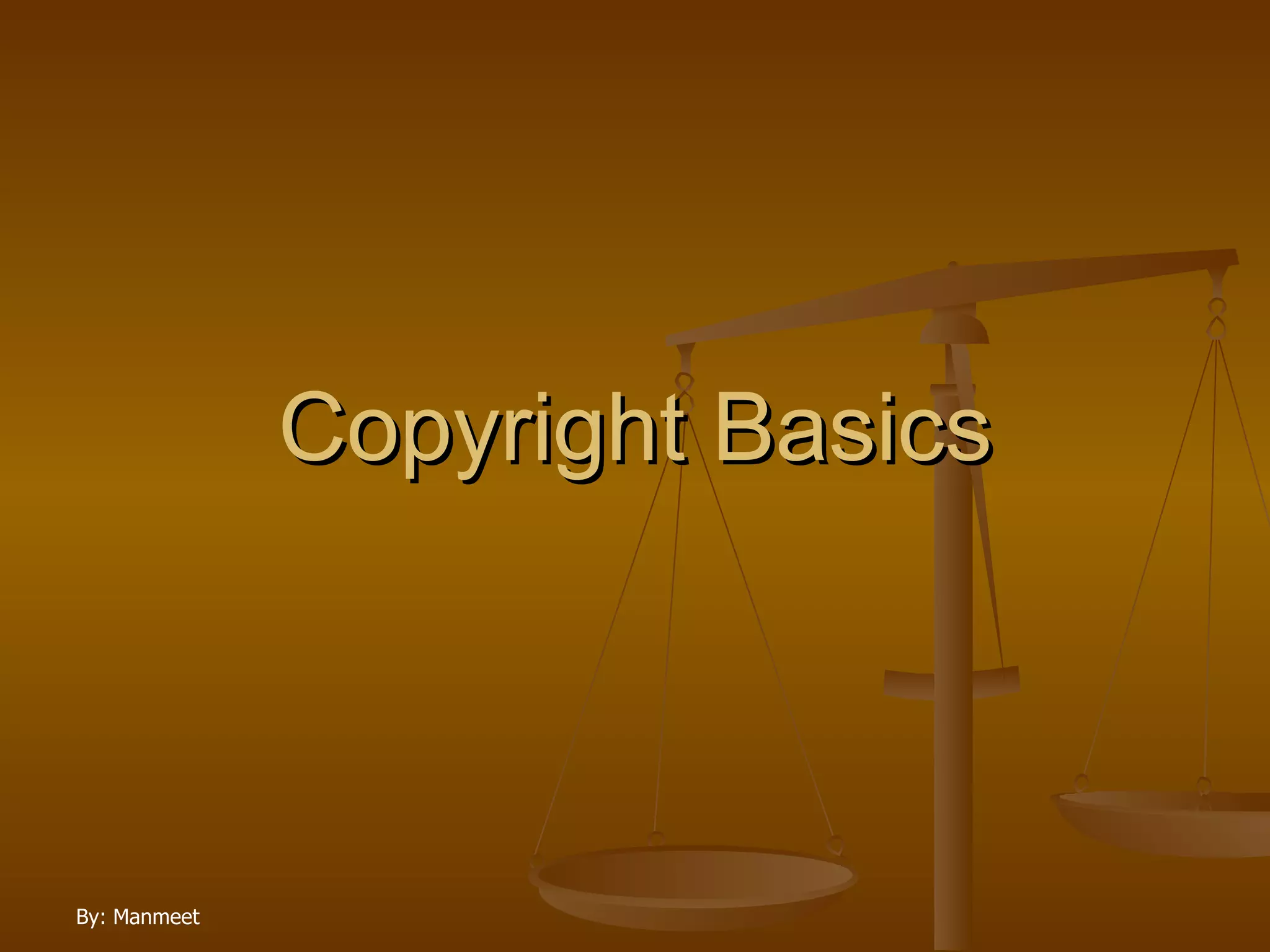 The document provides an overview of copyright basics, including what can be copyrighted, how long copyright lasts, fair use, and alternatives to copyright. It discusses that copyright is a form of intellectual property that gives authors exclusive rights over their creative works for a certain period of time. Copyright protects original works such as literature, music, artwork, films, and software from unauthorized copying and distribution. The length of copyright depends on factors such as if the work is published, and generally lasts for the life of the author plus 70 years. The document also outlines exceptions for fair use and alternatives to traditional copyright like open licenses.