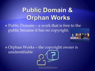 This document provides an overview of copyright law as it relates to educational use of materials. It defines key concepts like public domain, orphan works, and fair use. It notes that while some assume everything online is free to use, copyright still applies. Fair use allows limited use of copyrighted works without permission if the use is fair, reasonable, and does not impair the value or profits of the original. The document outlines the 4 factors considered for fair use and discusses licenses and permission. It provides resources for determining if permission is needed and how to obtain it.