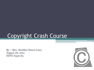 Copyright refers to the rights granted to authors for protection of their original works. These rights are granted automatically upon creation of a work and do not require registration. Copyright laws have been in effect since the 1790s and continue to be updated to account for technological changes. Under copyright law, owners have the exclusive rights to reproduce, distribute, create derivatives of, publicly perform, and publicly display their works. Violations can result in fines, damages, and prison time. Educators must abide by fair use and TEACH Act guidelines when utilizing copyrighted works in teaching to avoid liability.