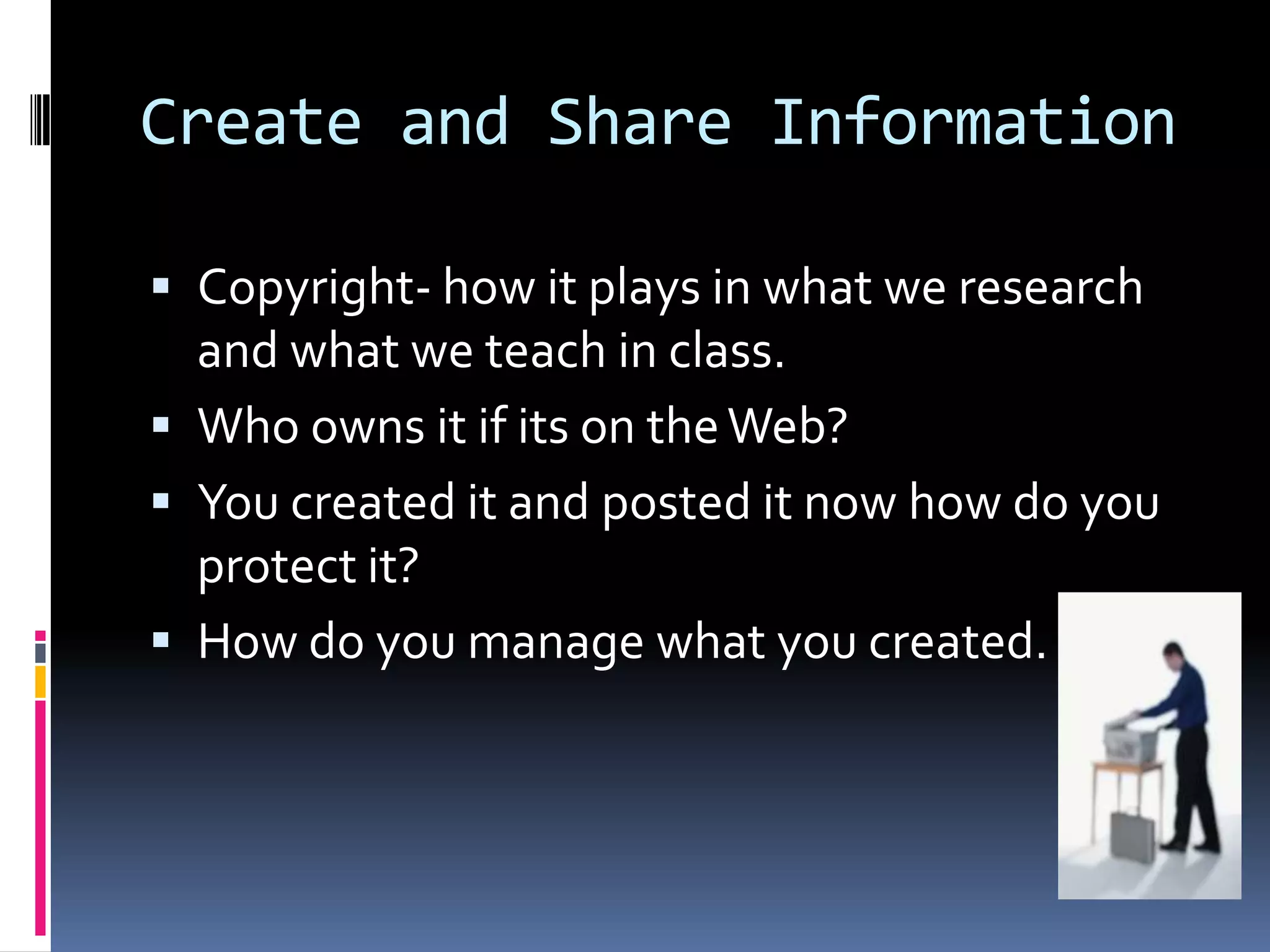 This document provides an overview of copyright and how it relates to researching and teaching. It discusses who owns copyrighted work, how to protect one's own work, and how to manage copyrighted materials. The key points are: copyright protects creative works from the moment of creation; using creative commons is an easy way to protect one's own work while allowing sharing; and when using outside information or open access materials, proper attribution is important. The purpose of copyright is to encourage knowledge sharing while respecting ownership rights.