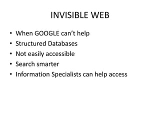 This document provides an overview of copyright and fair use as it relates to using material from the internet. It discusses some challenges in accessing information not indexed by search engines, as well as efforts to identify works in the public domain and orphan works. The document also outlines copyright protections for internet content, the concept of implied versus express licenses, and potential liabilities for individuals, universities and libraries. It provides guidance on determining if permission is needed to use a copyrighted work and identifies resources for obtaining permissions or licenses.