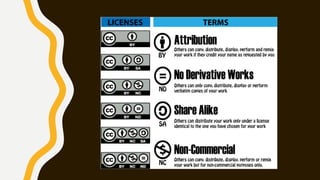 Copyright law gives creators ownership over original works they produce. It provides exclusive rights to reproduce, distribute, perform, display, and create derivatives of a work. Creative Commons licenses allow sharing and use of works under certain conditions. Fair use permits limited use of copyrighted works for purposes like teaching without permission. Infringement is using copyrighted works without permission and can result in penalties. Public domain works are not protected by copyright and can be freely used.