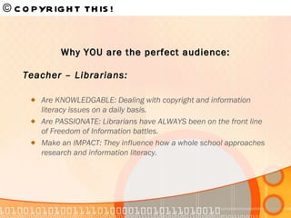 The document provides an overview of a presentation on copyright and the use of public domain materials for student projects. It discusses Canadian copyright law, fair dealing, and collective licensing. It then outlines the goals of bringing teachers up to date on copyright issues, provoking debate on this topic, and demonstrating how to create multimedia projects using public domain resources. Several websites containing public domain and Creative Commons licensed materials are also listed.