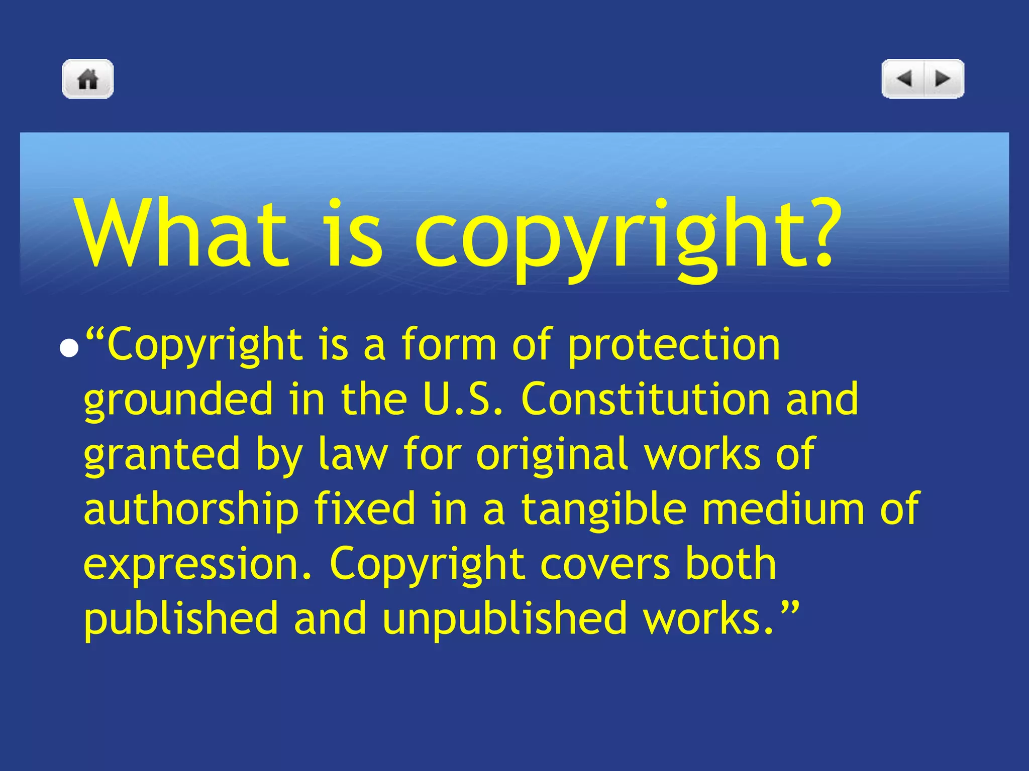 The document provides an overview of copyright law, emphasizing its protection of original works and the ownership rights of authors. It discusses the TEACH Act, which grants educators specific rights beyond fair use, and outlines the concept of fair use with a four-factor test. Additionally, it highlights the importance of obtaining permissions for using copyrighted material and provides resources for further information.