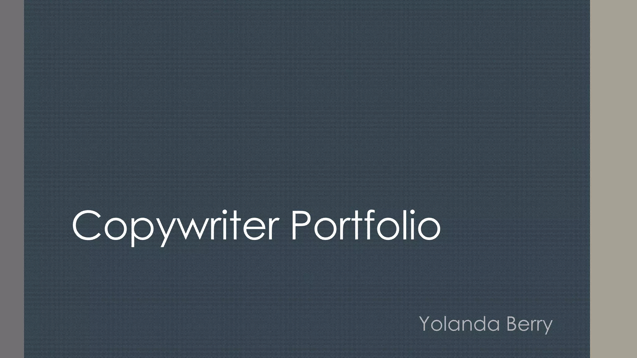 Yolanda Berry's copywriting portfolio contains headlines, tags, captions and slogans she has created for mock advertisements. It also includes sample promotional brochures and flyers. The portfolio was created solely for displaying her professional copywriting work and is not intended for commercial use or endorsement of any products. It provides examples of her work in creating compelling promotional content for various industries including spas, cosmetics, food, insurance, photography, education and small businesses.