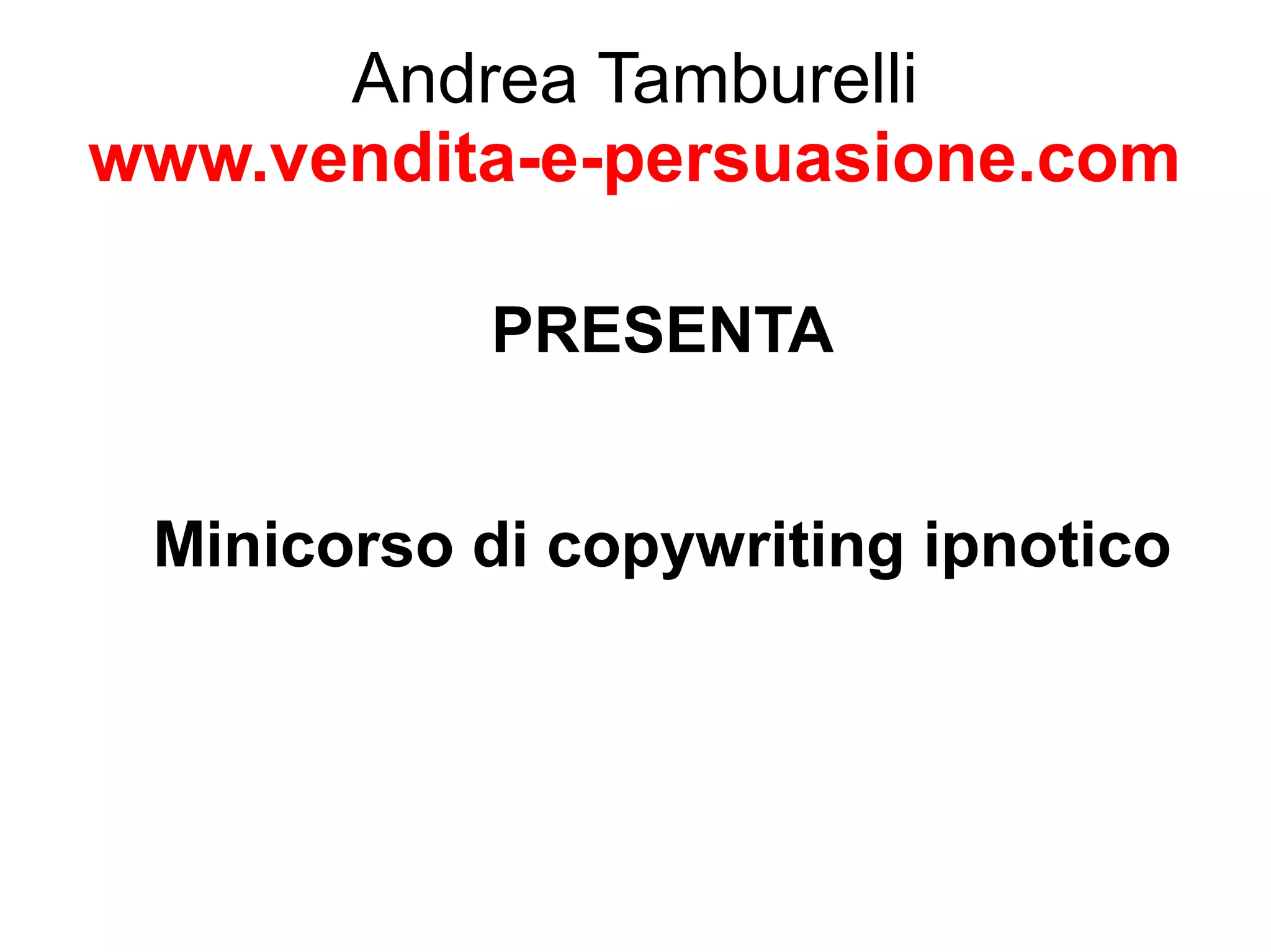 Il documento presenta un minicorso di copywriting ipnotico, evidenziando l'importanza della comunicazione persuasiva per affascinare e influenzare il lettore. Illustra tecniche di copywriting che combinano principi di persuasione e conoscenza della mente umana per generare testi efficaci e coinvolgenti. A sottolineare il valore del copywriting ipnotico, l'autore condivide la sua esperienza e suggerimenti pratici per attirare e mantenere l'attenzione del pubblico.