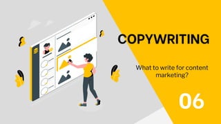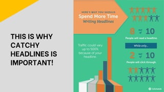The document provides tips and formulas for writing effective headlines and calls to action for content marketing. It discusses important headline structures, such as identifying a problem and offering a solution. Example formulas include John Caples' method of offering a solution first or using emotionally driven "Little Known Ways" headlines. The document also covers tailoring content to match an audience's personality by considering the tone of voice and primary purposes of informing, persuading, or entertaining. Tips are provided for writing compelling calls to action through the use of strong verbs, a sense of urgency, persuasive writing, and eye-catching buttons or colors.