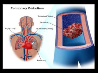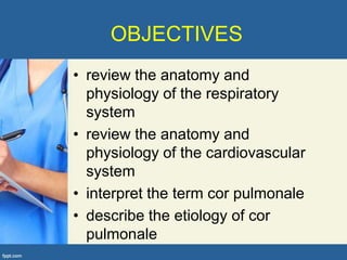This document provides an overview of cor pulmonale, including its objectives, definitions, etiology, pathogenesis, clinical manifestations, diagnosis, management, and nursing considerations. Cor pulmonale is defined as enlargement of the right ventricle due to lung disease and results in pulmonary hypertension. Common causes include COPD and pulmonary embolism. Symptoms include dyspnea and edema. Diagnosis involves physical exam, imaging, and cardiac catheterization. Treatment includes oxygen, diuretics, and lung transplantation in severe cases. Nursing focuses on managing symptoms and promoting rest and nutrition.