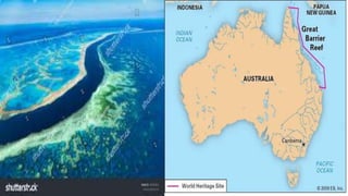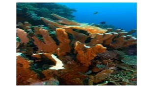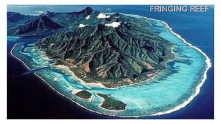 The document discusses coral reefs, including their development, types, and importance. It defines coral reefs as structures formed from the accumulated calcium carbonate skeletons of coral polyps. Coral reefs are classified based on their structure and location, including fringing reefs along coastlines, barrier reefs separated from coastlines by lagoons, and atolls which are ring-shaped reefs surrounding a central lagoon. Coral reefs provide important habitat but are threatened by bleaching due to rising water temperatures and other human impacts like pollution.