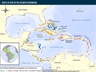 Coral reefs are underwater structures formed from calcium carbonate secreted by coral polyps that support diverse marine ecosystems. They exist as barrier reefs, like the Belize Barrier Reef, atolls which surround lagoons, and fringe reefs along coastlines throughout the Caribbean. However, overdevelopment, pollution, destructive fishing practices, tourism, ocean warming, and other threats have led to substantial declines in Caribbean coral reefs over the last 30 years, endangering these important ecosystems.