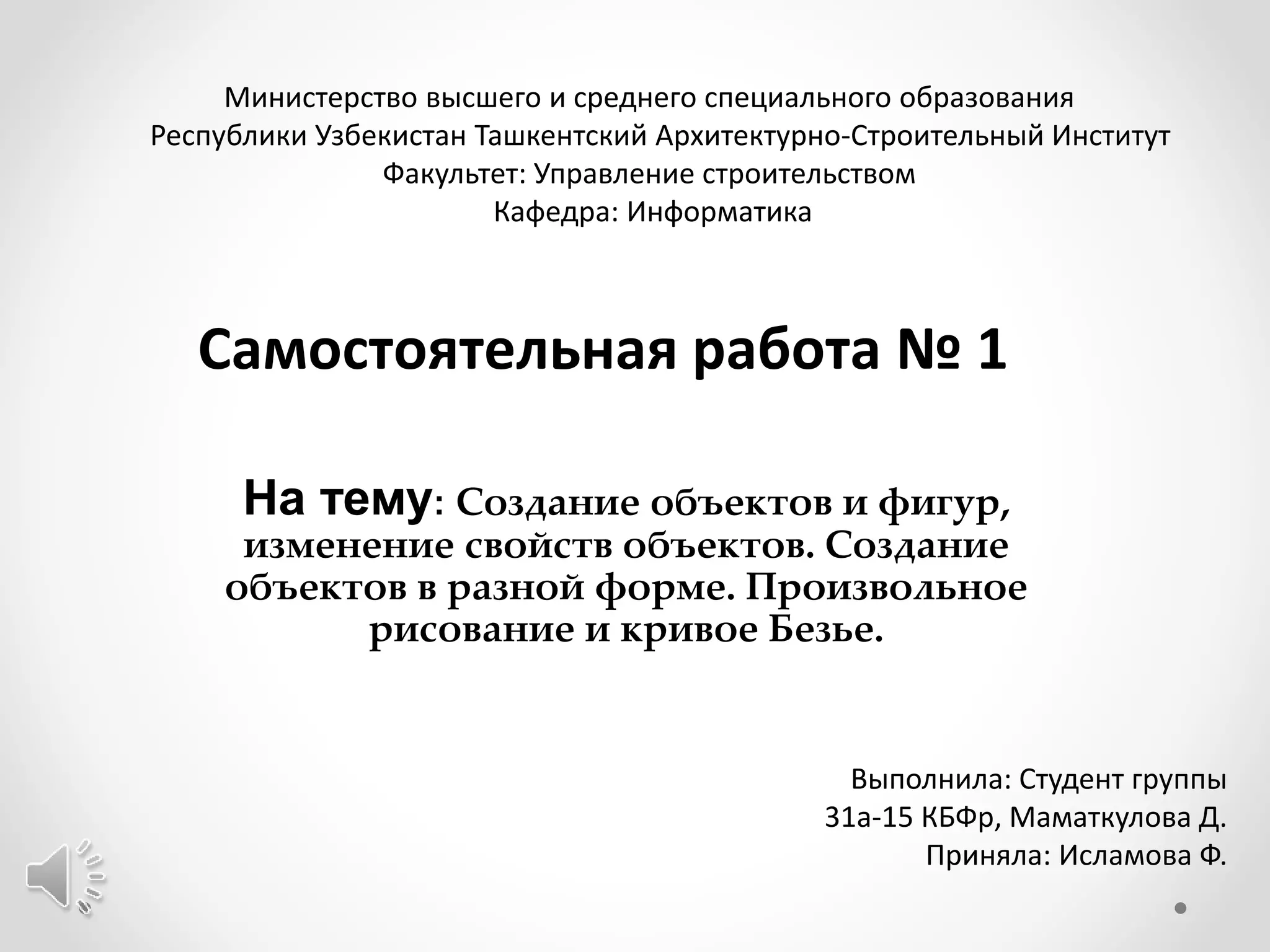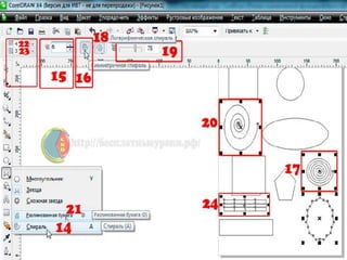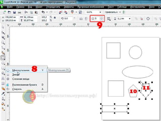 Документ описывает создание объектов и фигур в программе CorelDRAW, включая многоугольники, спирали и решетки. В нем перечислены шаги для изменения свойств объектов и манипуляции с инструментами, такими как пипетка и ковш для клонирования объектов. Также освещается использование инструмента Безье для построения кривых и полигональных контуров.