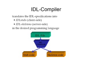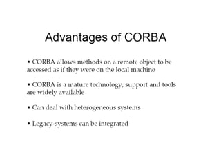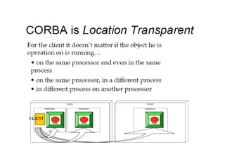 CORBA and DCOM are specifications for distributed computing that allow objects to communicate across a network. CORBA uses an Object Request Broker (ORB) as middleware to locate and invoke remote objects transparently. It defines an Interface Definition Language (IDL) and supports location transparency. DCOM is Microsoft's version that extends COM to allow components to interact remotely. It uses proxies on the client side and stubs on the server side to marshal requests and responses.