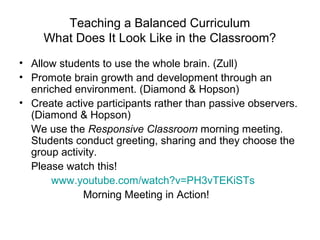 Best practices are teaching strategies that are progressive, developmentally appropriate, research-based, and teachable. They include teaching a balanced curriculum through an enriched environment that promotes active learning and brain development, teaching an integrated curriculum where students make connections across disciplines and take ownership of their learning, and differentiating instruction to accommodate individual student needs, strengths, and learning styles. While some research shows that certain instructional techniques like Whole Brain Teaching have led to improved test scores, barriers remain to fully implementing practices that identify and reward the most effective teachers.