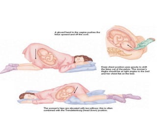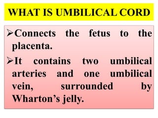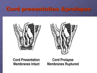 Umbilical cord prolapse occurs when the umbilical cord descends alongside or beyond the fetal presenting part during labor and delivery. It can cut off blood and oxygen supply to the fetus, potentially causing damage or death. Risk factors include prematurity, abnormal fetal position, polyhydramnios, and multiparity. Diagnosis is made through physical exam finding the cord in the vagina and a decreased fetal heart rate below 120 bpm. Immediate management depends on whether the baby is alive or dead, and involves vaginal delivery if possible or emergency c-section otherwise to prevent hypoxic injury or death.