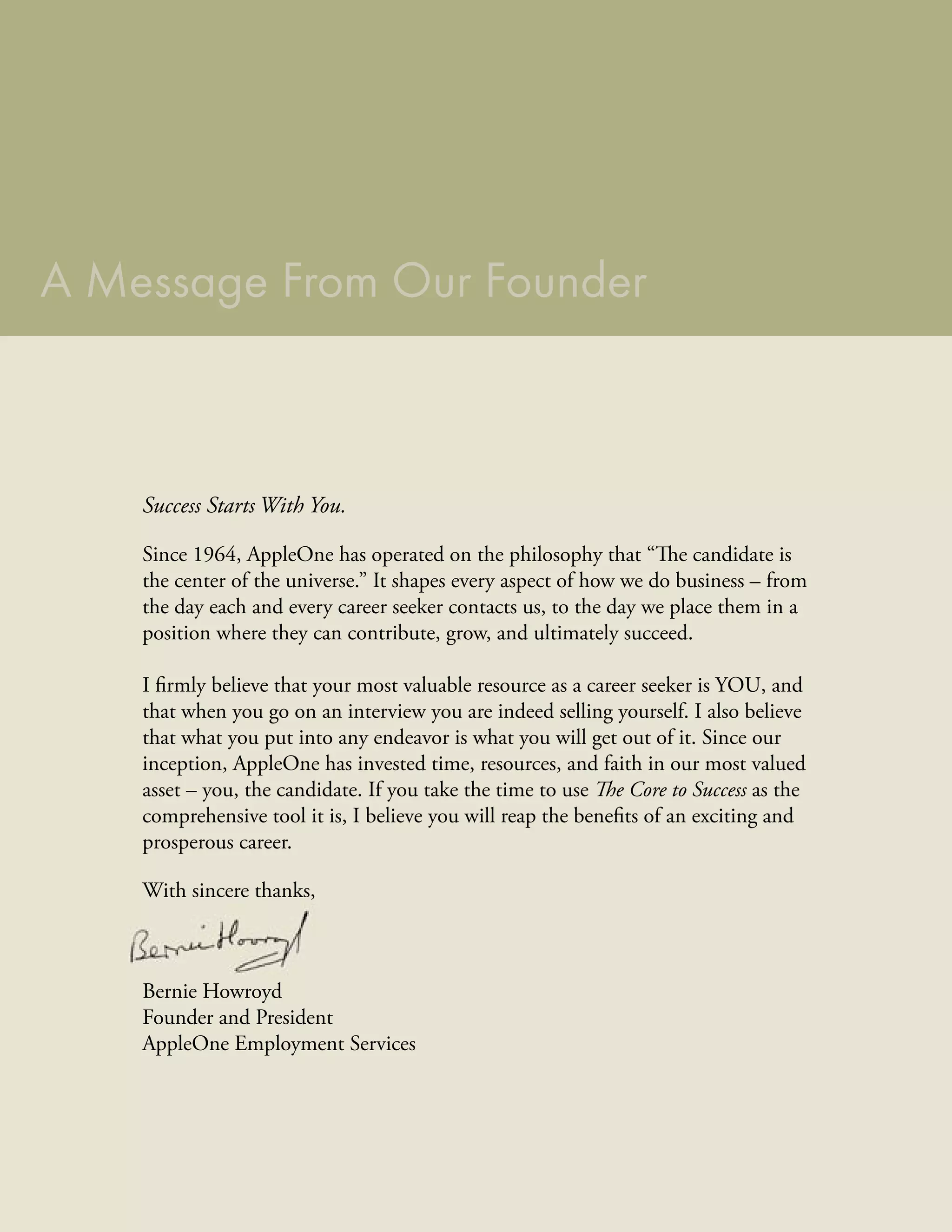 The document from AppleOne emphasizes the importance of candidates in the hiring process, providing a comprehensive guide on creating an effective resume, preparing for interviews, and following up. Key steps include understanding one's skills and tailoring resumes for specific positions, as well as practicing mock interviews and maintaining professionalism during the interviewing stages. The founder, Bernie Howroyd, encourages career seekers to invest in their personal branding and preparation for a prosperous career.