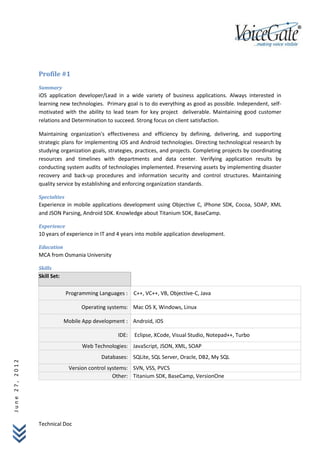 This document profiles 3 mobile application developers with experience in iOS, Android, and other platforms. Profile 1 has 10 years of IT experience including 4 years in mobile development. Profile 2 has 7+ years of mobile development experience including 2 years with Android. Profile 3 has 8+ years of experience including 2+ years in mobile development using technologies like C/C++, Linux, iOS, Android and Symbian. All 3 profiles list relevant skills and experience in mobile platforms, programming languages, databases, and version control systems.