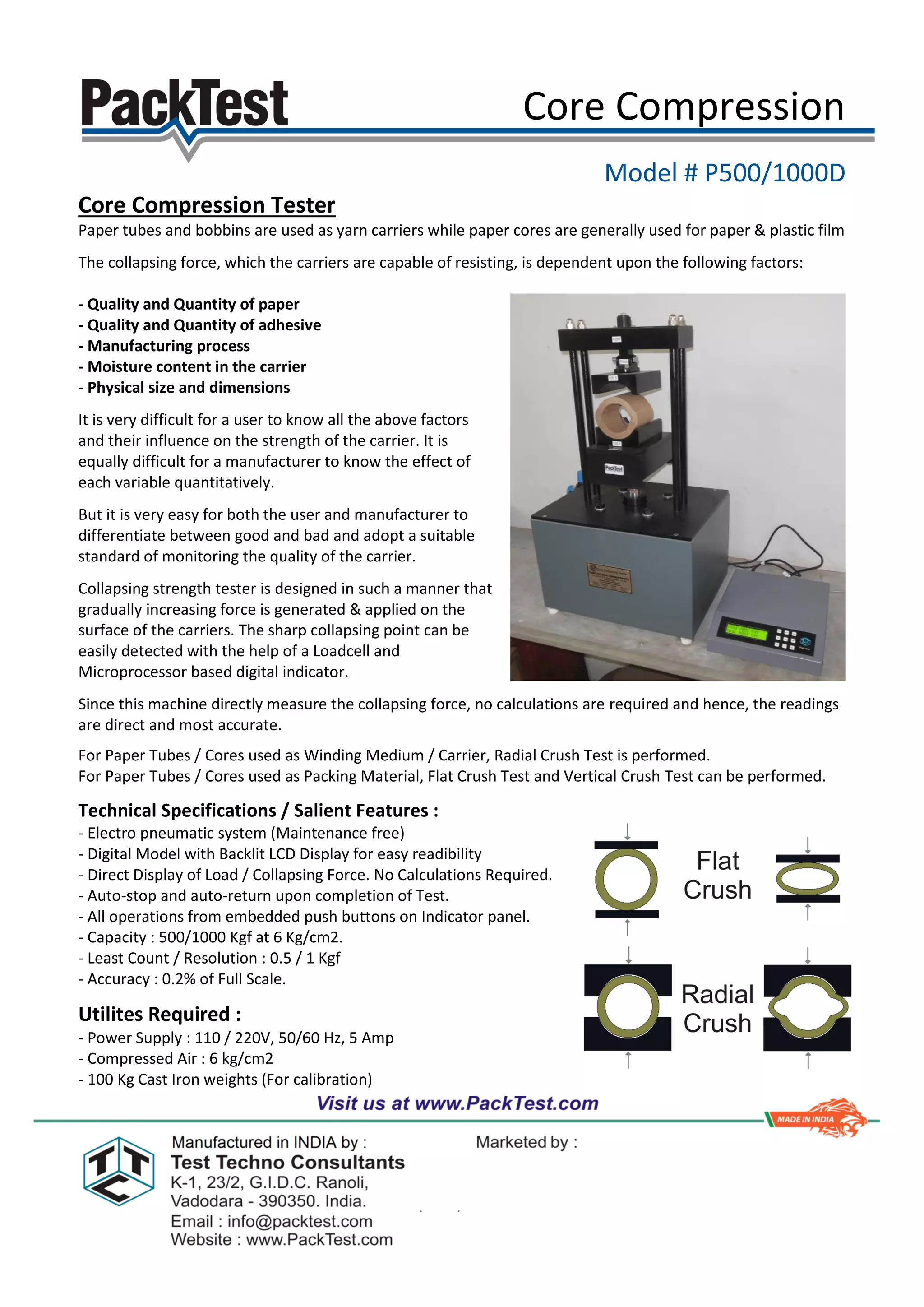 This document describes the Core Compression Model #P500/1000D, a machine used to test the collapsing strength of paper tubes, bobbins, and cores. It directly measures the collapsing force without requiring calculations. The collapsing strength depends on factors like the quality and quantity of paper and adhesive used, the manufacturing process, and moisture content. The machine applies gradually increasing force to the carrier and easily detects the sharp collapsing point using a loadcell and digital indicator. It can perform radial, flat, or vertical crush tests depending on the intended use of the paper tube or core.