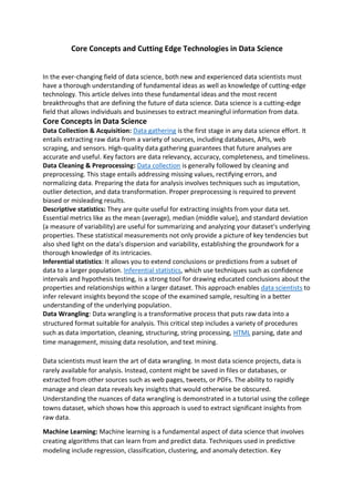 The document provides an overview of core concepts and advanced technologies in data science, emphasizing the importance of understanding foundational ideas coupled with emerging innovations. Key topics include data collection, cleaning, exploratory data analysis, machine learning techniques, and modern technologies such as AI, big data, and cloud computing. It underscores that a combination of foundational knowledge and continual learning of cutting-edge tools is essential for success in the evolving field of data science.