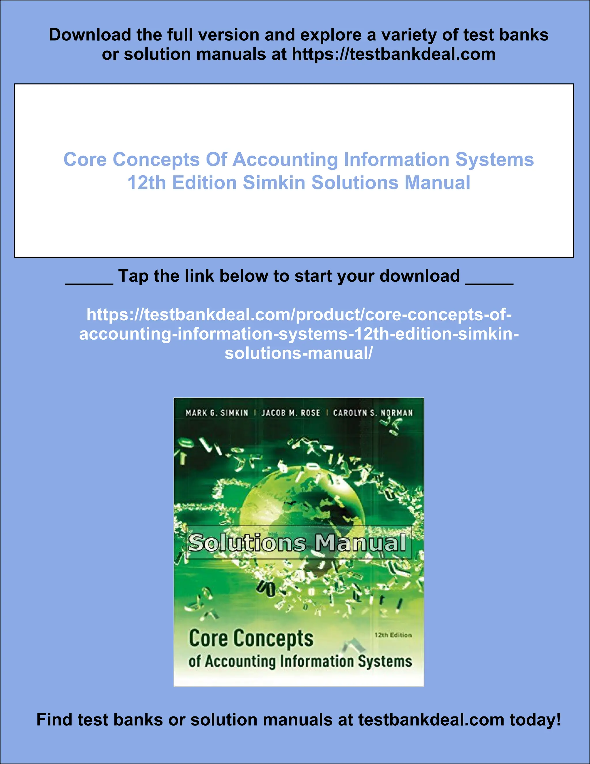 Download the fullversion and explore a variety of test banks or solution manuals at https://testbankdeal.com Core Concepts Of Accounting Information Systems 12th Edition Simkin Solutions Manual _____ Tap the link below to start your download _____ https://testbankdeal.com/product/core-concepts-of- accounting-information-systems-12th-edition-simkin- solutions-manual/ Find test banks or solution manuals at testbankdeal.com today!