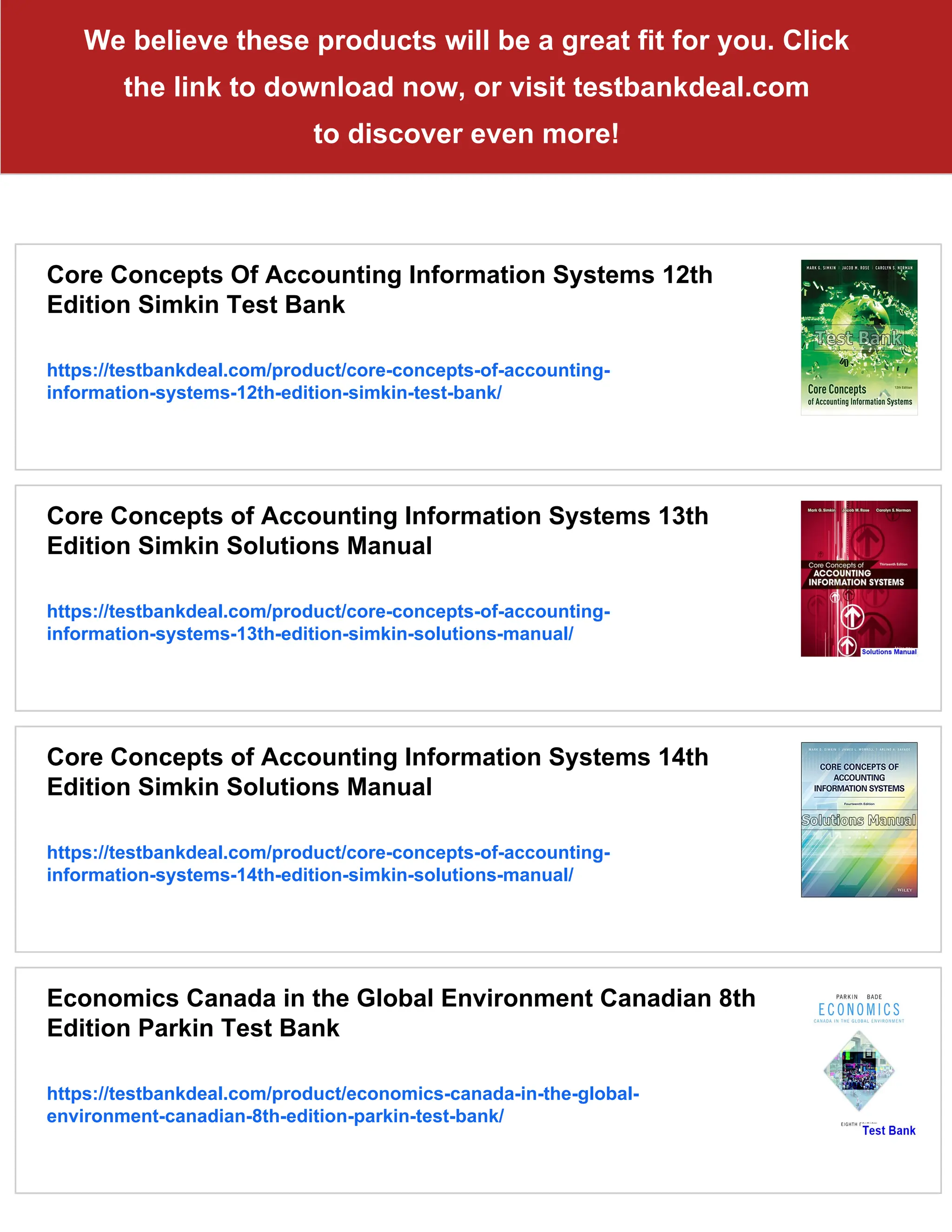 We believe theseproducts will be a great fit for you. Click the link to download now, or visit testbankdeal.com to discover even more! Core Concepts Of Accounting Information Systems 12th Edition Simkin Test Bank https://testbankdeal.com/product/core-concepts-of-accounting- information-systems-12th-edition-simkin-test-bank/ Core Concepts of Accounting Information Systems 13th Edition Simkin Solutions Manual https://testbankdeal.com/product/core-concepts-of-accounting- information-systems-13th-edition-simkin-solutions-manual/ Core Concepts of Accounting Information Systems 14th Edition Simkin Solutions Manual https://testbankdeal.com/product/core-concepts-of-accounting- information-systems-14th-edition-simkin-solutions-manual/ Economics Canada in the Global Environment Canadian 8th Edition Parkin Test Bank https://testbankdeal.com/product/economics-canada-in-the-global- environment-canadian-8th-edition-parkin-test-bank/