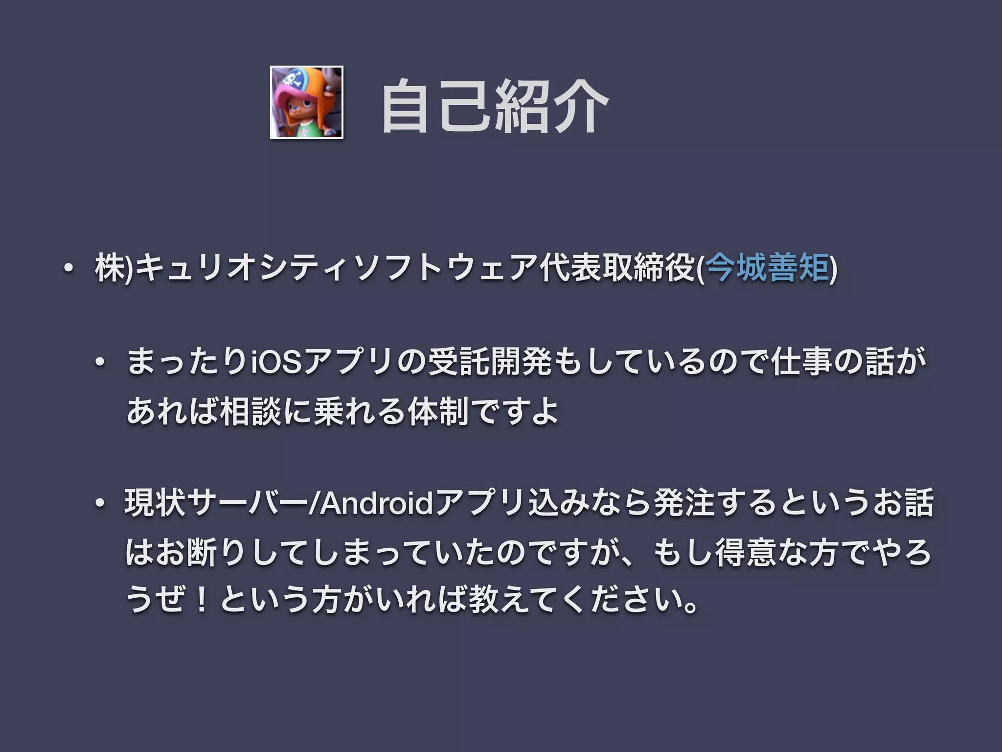 自己紹介 • 株)キュリオシティソフトウェア代表取締役(今城善矩) • まったりiOSアプリの受託開発もしているので仕事の話が あれば相談に乗れる体制ですよ •