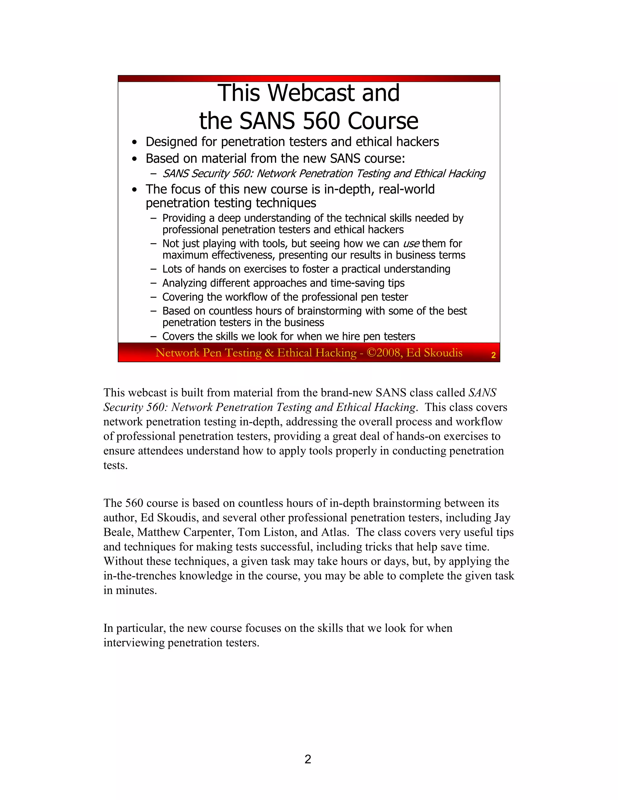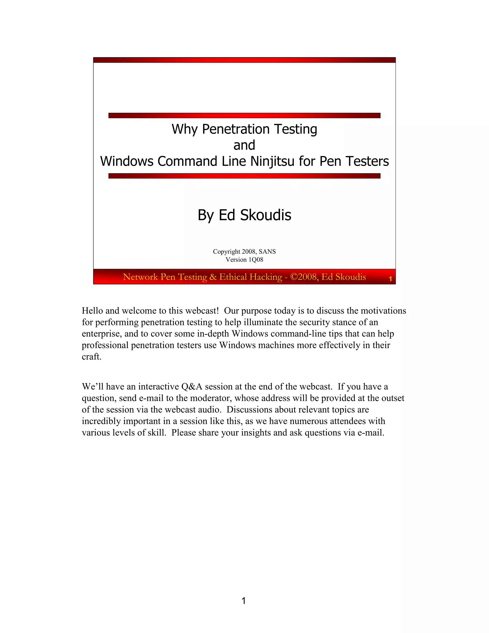 This document provides an overview and outline of an upcoming webcast on penetration testing and ethical hacking. The webcast will discuss the motivations for performing penetration tests and cover some Windows command line tips useful for penetration testers. It will include an interactive Q&A session. The webcast material is based on the SANS Security 560 course, which teaches in-depth penetration testing techniques and skills. It focuses on real-world workflows and hands-on exercises to teach practical skills.