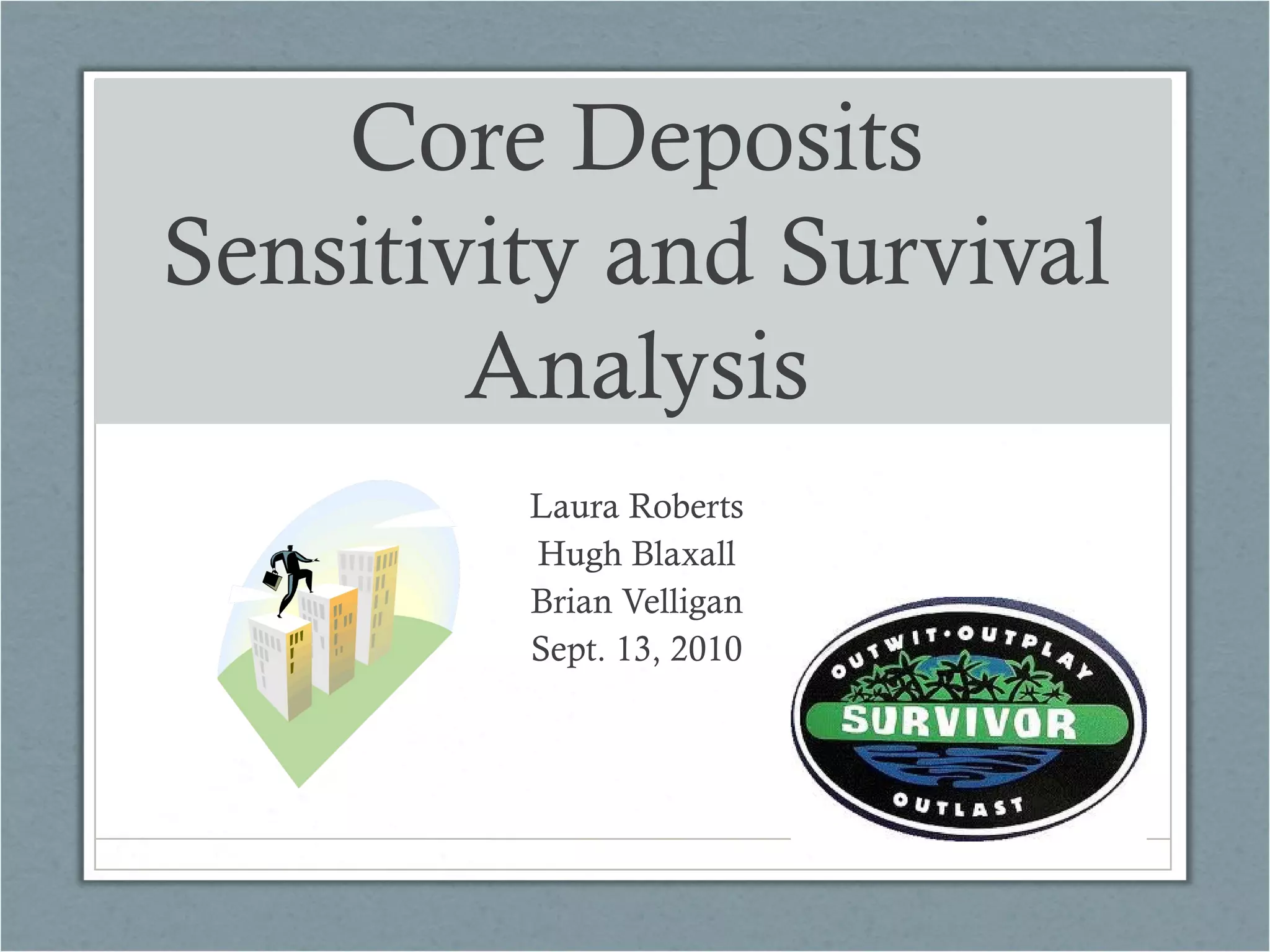 The document discusses the methodologies for analyzing core deposits, focusing on account duration and survival analysis to better predict how long individuals keep their accounts open. Visual summaries, such as histograms, and statistical tools like survival analysis are essential for accurately summarizing account duration due to the presence of censored data. It outlines the distinction between person-level and person-period datasets, emphasizing the advantages of using a person-period dataset for effective analysis.