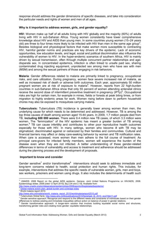 The document discusses the importance of addressing gender equality in Global Fund proposals and responses to HIV, TB, and malaria. It notes that women often have less access to health services and information than men due to social and economic inequalities. It provides examples of how diseases like HIV, malaria, and TB disproportionately impact women. The document advises applicants to involve gender experts and conduct a gender analysis to ensure their proposals address the specific needs of women, men, girls and boys. It also recommends integrating gender-sensitive and transformative interventions that promote human rights and reduce health inequalities.